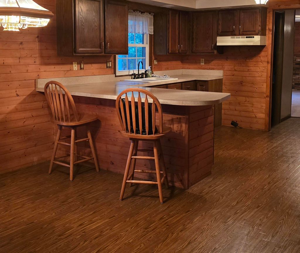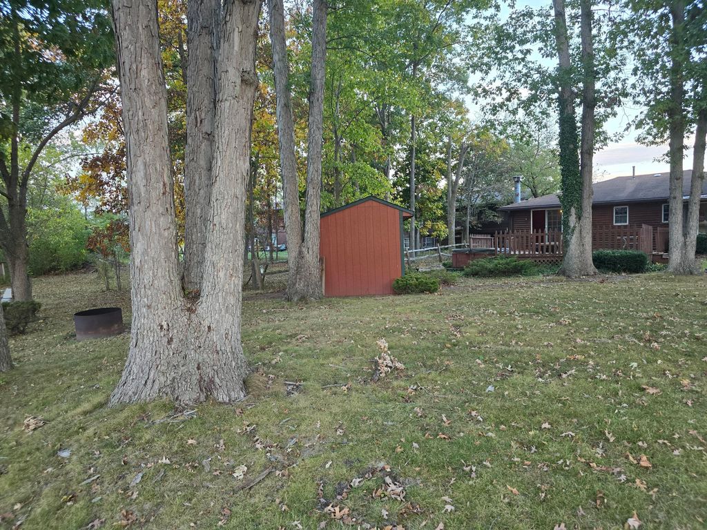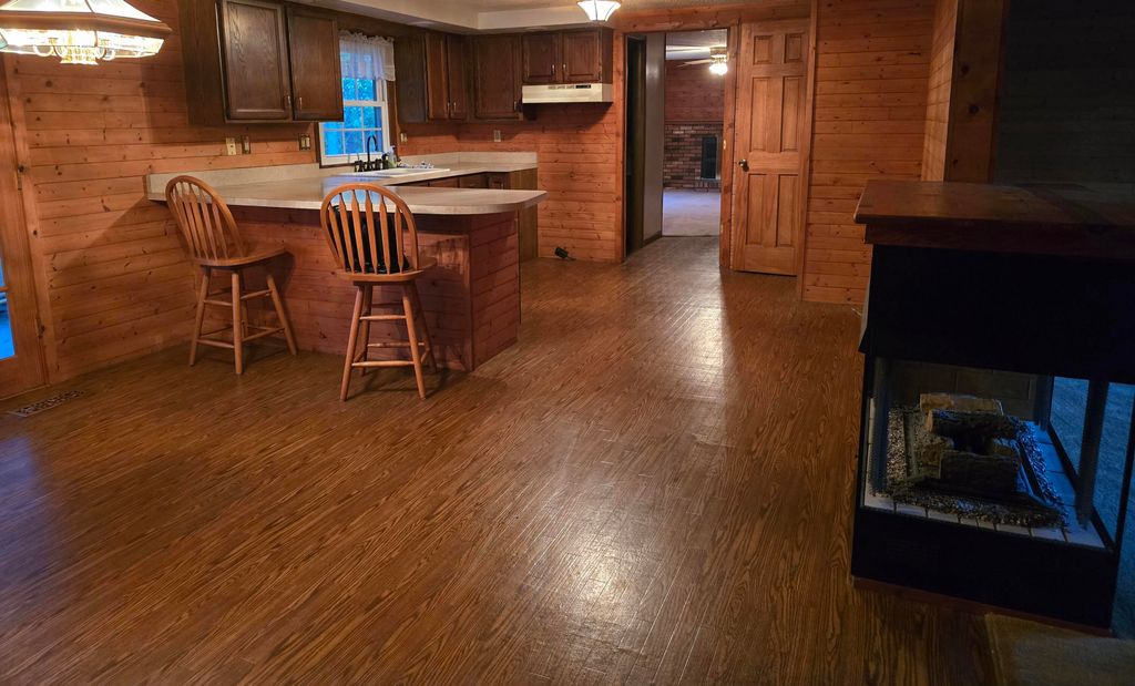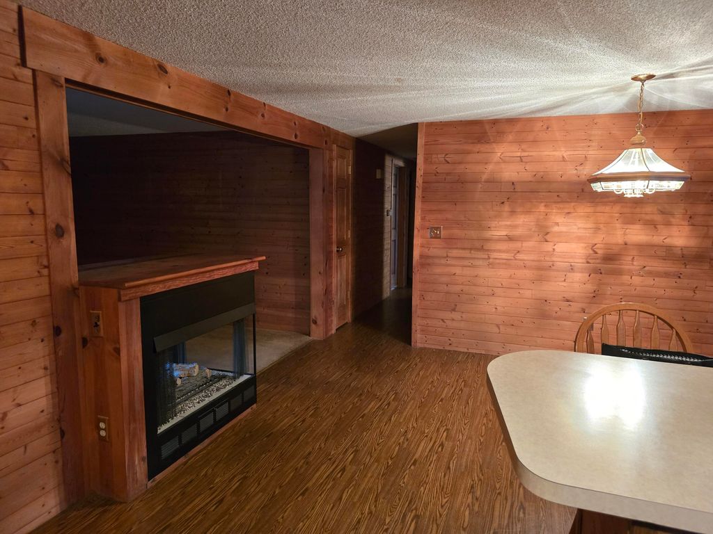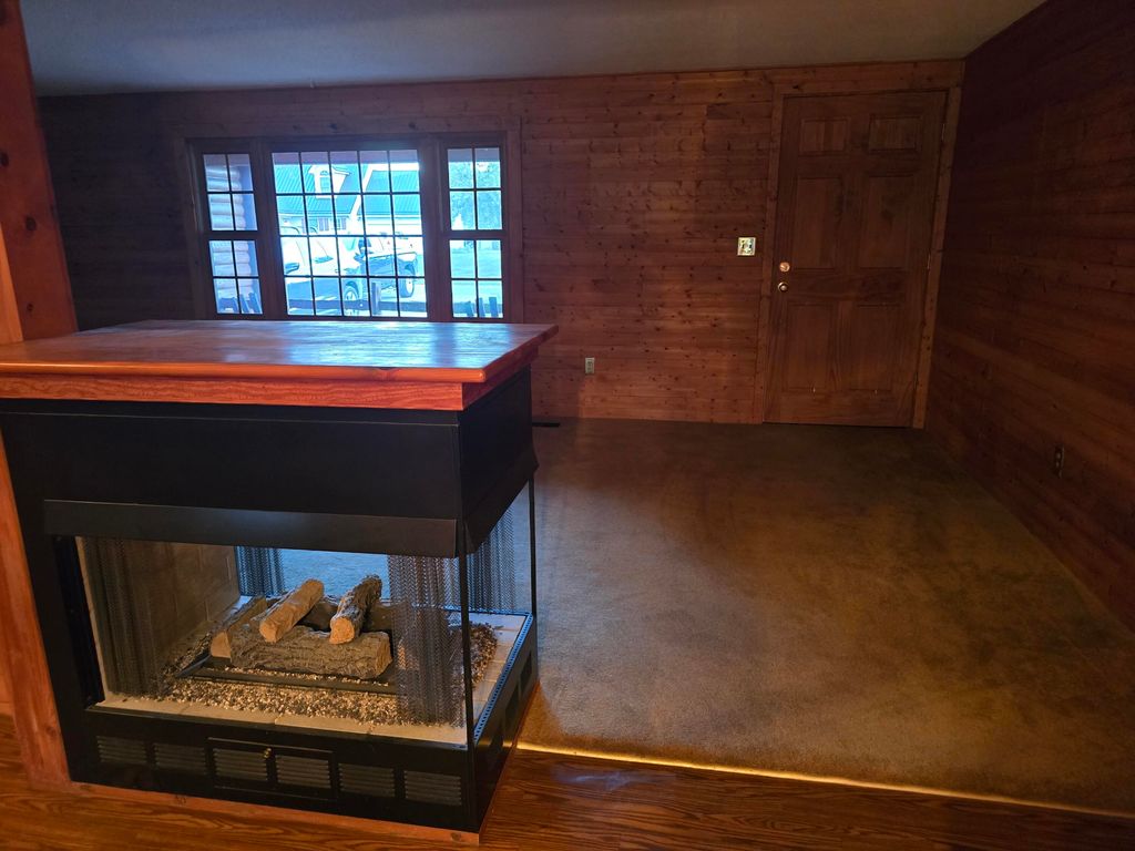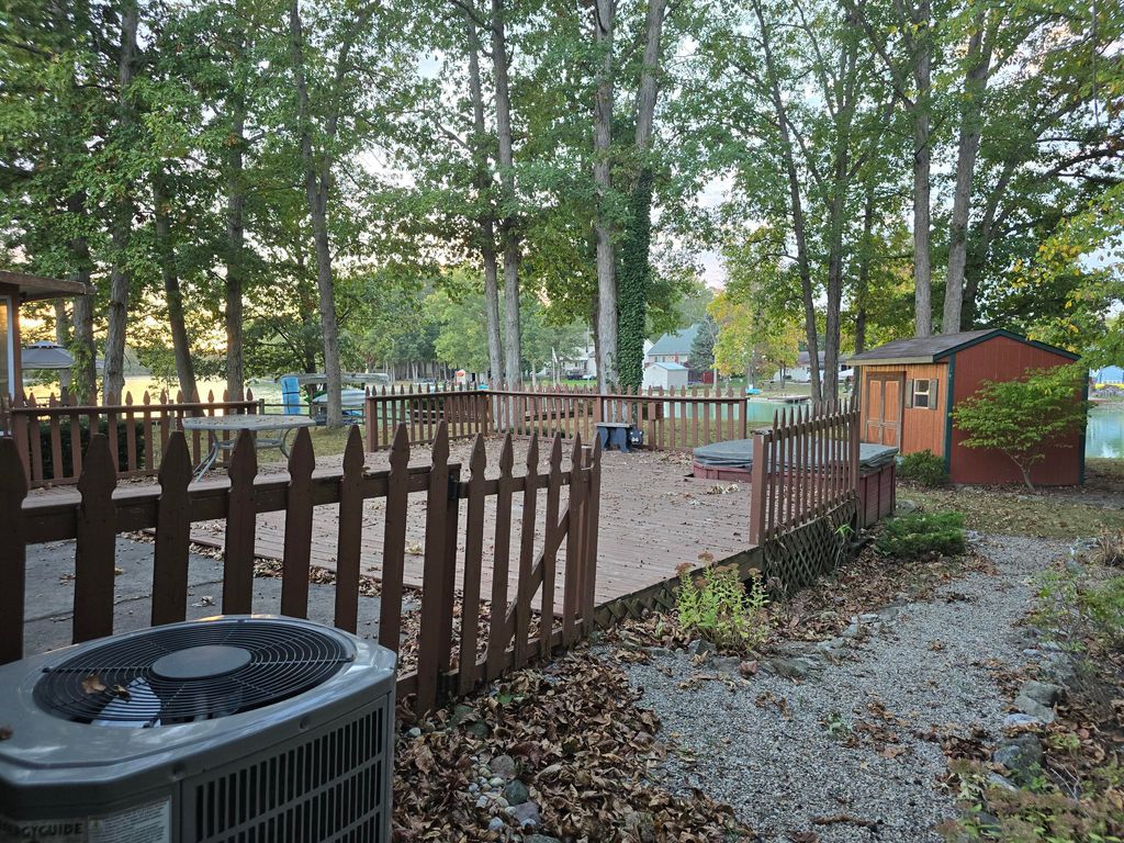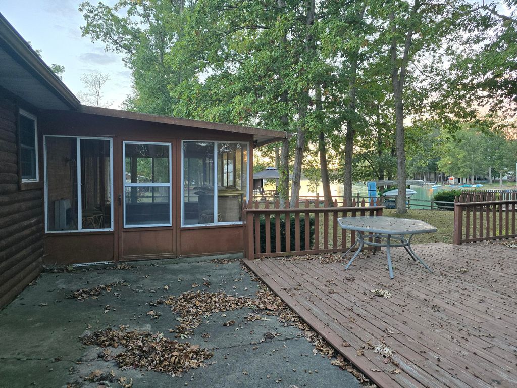 Ranch home with log siding, Beautiful view of the lake in back yard with a boat dock and two nice deck in back. hot tub hasn't been use in 15 yrs so owner is unsure if it work. Home has 2 gas fire places. SUNROOM OFF OF DINING ROOM. New central air unit.