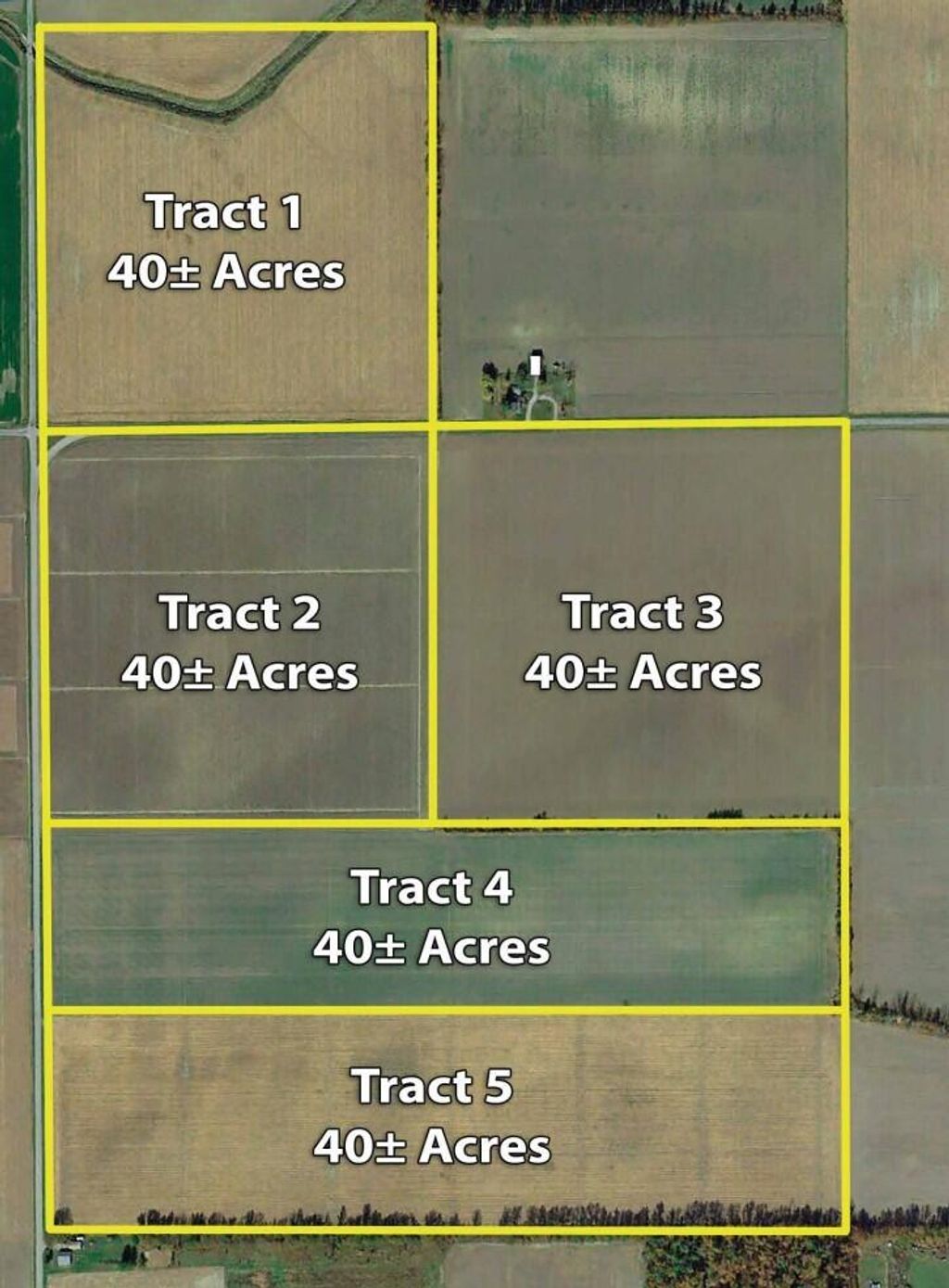 Tract 1 of 5: 40.76± acres. Road frontage along Rd. 111 & Rd. 133. Soil types include Roselms silty clay (RpA/RpB2), Paulding Clay (Pc), Wabasha silty clay loam (Wb), Roselms silty clay loam (RoA). Selling at public auction, Nov. 13 @ 6 pm. 5% non-refundable down payment due at end of auction. Balance at closing on or before 30 days. Auction held offsite @ Youth Leadership building, Paulding Co. Fairgrounds.