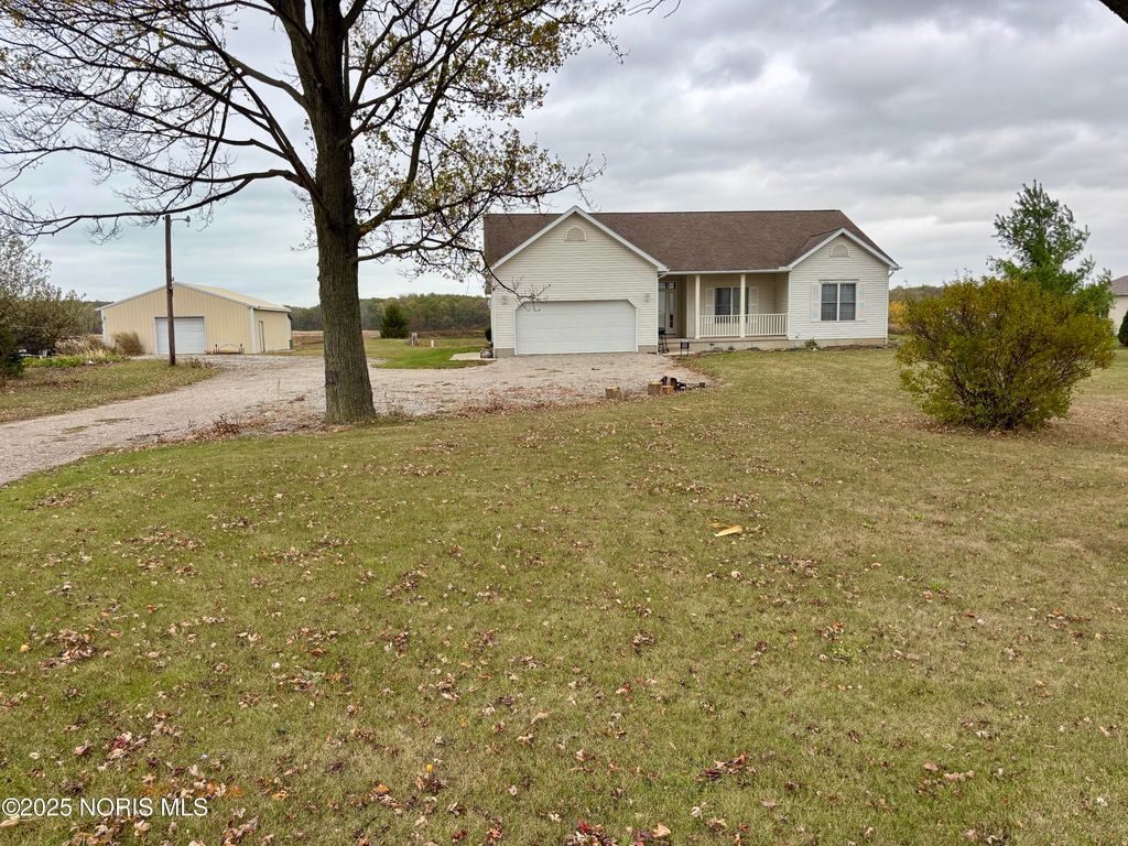 Welcome to 7105 N. Elliston Trowbridge Road! A 2005 build with 9 foot ceilings throughout, sitting on a beautiful 3 acres! This home currently has 2 bedrooms & an office, but the floor plan was designed for 3 bedrooms. A closet can easily be added to the office for a 3rd bedroom. 2002 sqft, including a large great room with gas fireplace. The sunroom is gorgeous, leading to the stamped concrete patio. You'll love the spacious primary suite, featuring a private bathroom with a soaking tub, separate shower, and 12x7 walk-in closet! 1st floor laundry room. Plus a full basement that gives you plenty of extra space! The pond & quiet country setting are so nice! You'll also appreciate the 960 sqft pole barn & 500 sqft detached garage/shed. This home & property offers so much! Set your showing today!