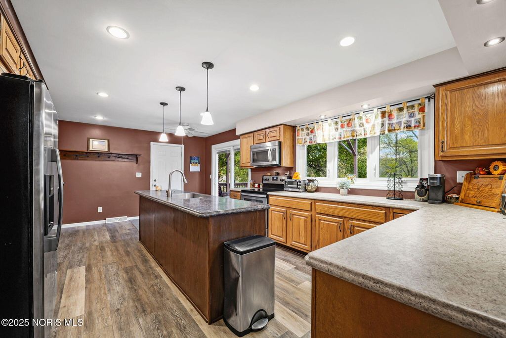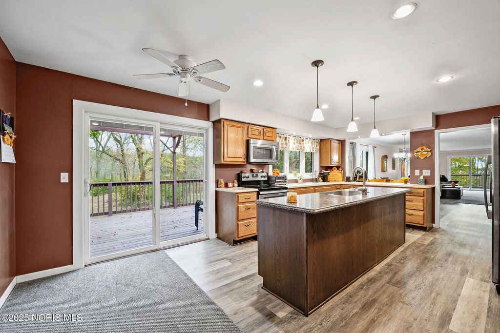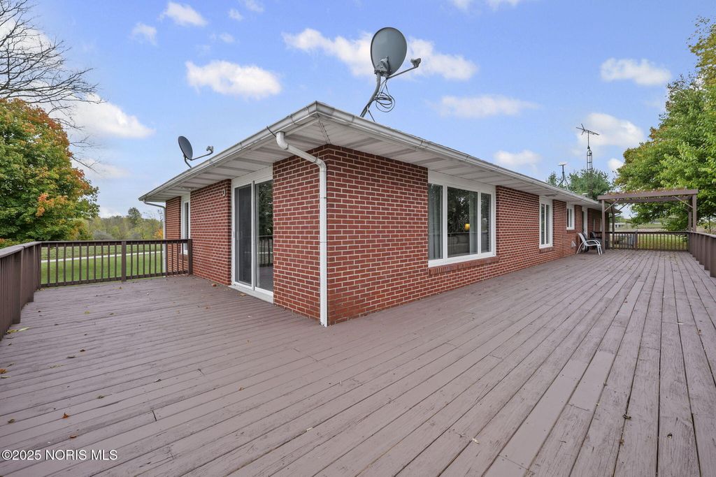 3600 SF of living space in this 5 bedroom brick ranch with custom heated tile floors in all 3 full baths! Two of the bedrooms, a full bath, spacious recreation room with fireplace and additional kitchenette are all located in the walk-out basement. This very well maintained home also features a fenced yard, huge wrap-around deck freshly stained in 2025, and additional 28x28 detached garage with wood burning stove. Roof new in 2010 and new windows in 2016. This unique property also comes with an option to purchase a 43.9l acre wooded parcel that includes an 8 acre pond (price TBD). Purchase only the house and garage, or buy it all to complete your sportsman's paradise!