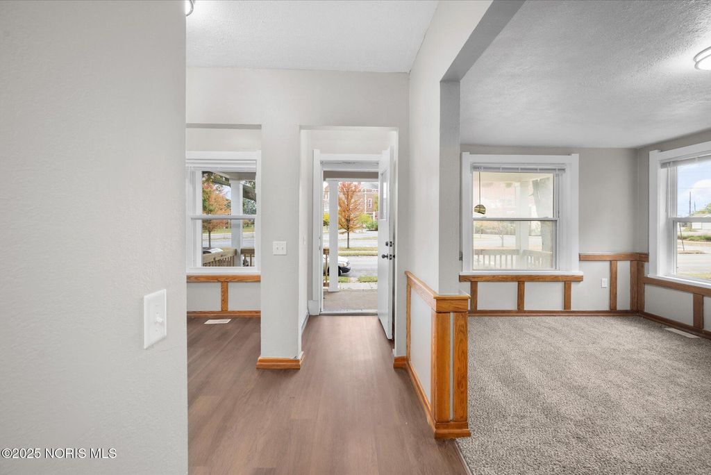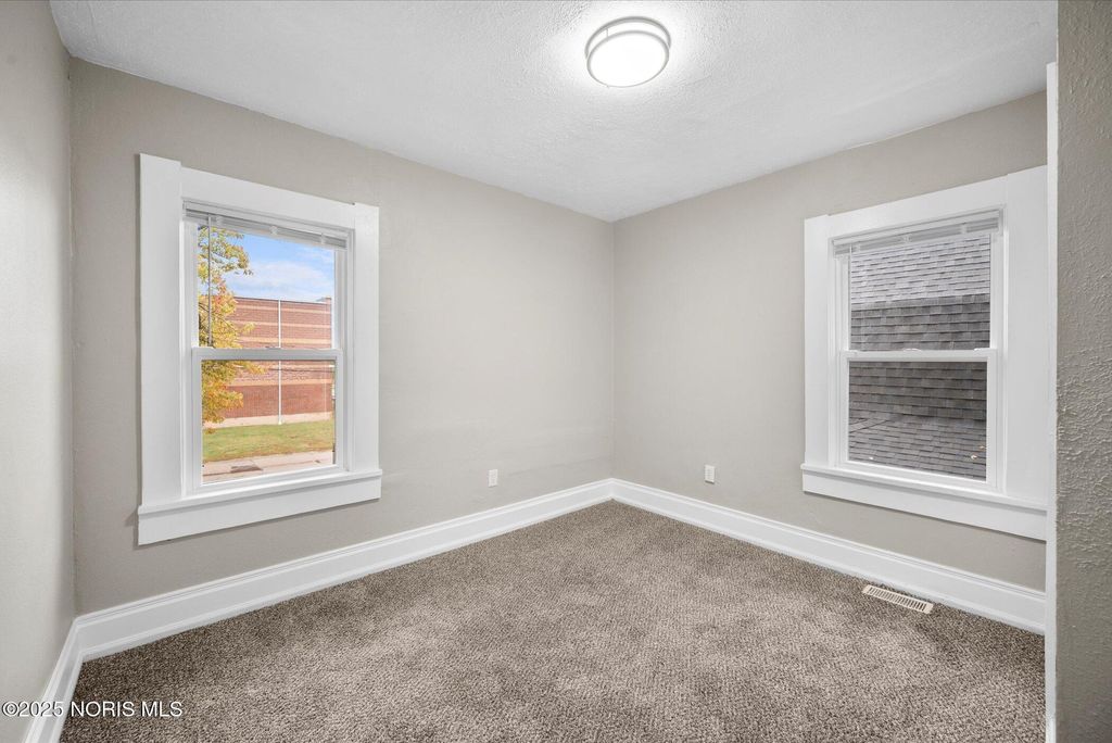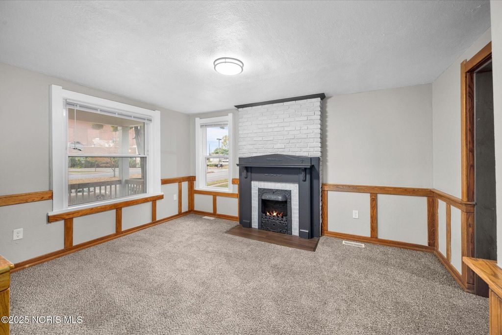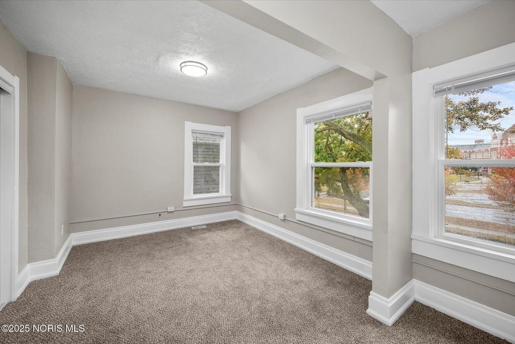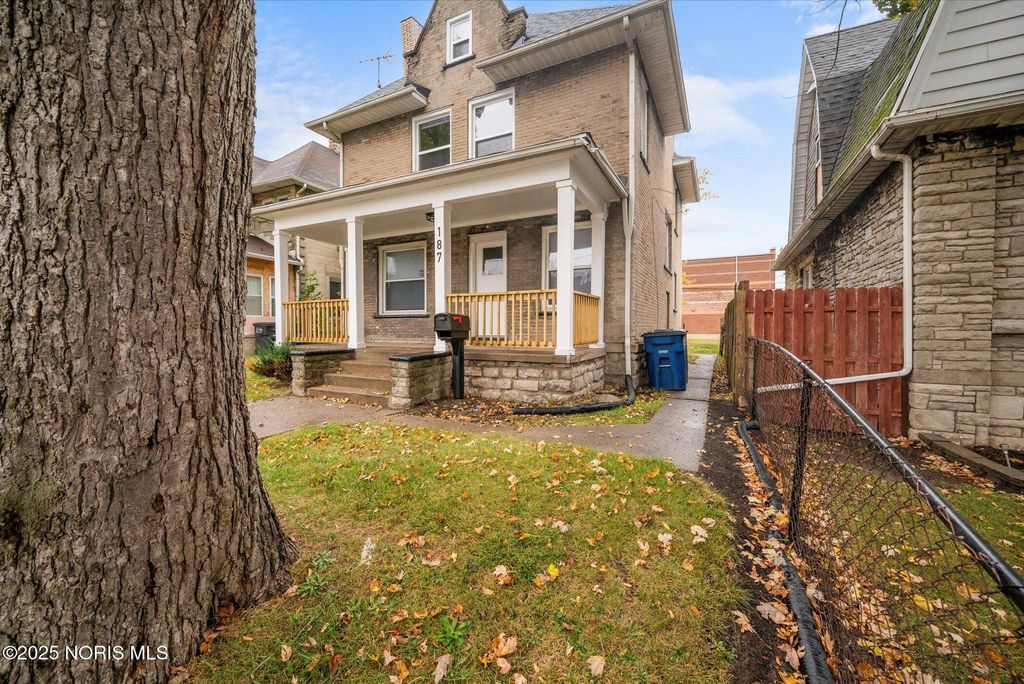 This spacious two-story brick home offers over 2,000 sq. ft. of living space, blending timeless character with thoughtful modern updates. Perfectly located right across from the high school, with the elementary school directly behind, and just one block from the Glass City Metropark and minutes from downtown, this home combines comfort, convenience, and community charm. The exterior features a covered front porch with a new railing, off-street parking in the back, and sliding doors off the family room that open to a small concrete patio"”perfect for relaxing or entertaining. Step inside through a welcoming entryway that leads to multiple inviting living areas. The front living room showcases a fireplace, original oak trim and wainscoting-style accents, highlighting the home's craftsmanship. Toward the back, the family room offers a fireplace, and a modern feel with fresh paint, new trim, and new carpet. The kitchen is spacious and functional, featuring updated fixtures, a tile backsplash, a dishwasher, and classic oak cabinetry. The dining area connects seamlessly with the front foyer, accented by a hall closet and more original wood details that preserve the home's charm. Upstairs, you'll find three comfortable bedrooms with new carpet, updated light fixtures, new doors, and blinds, along with two completely renovated full bathrooms featuring modern vanities, new tub surrounds, vinyl plank flooring, and updated finishes. The primary bedroom includes its own private bath for added convenience. The home's dual stairway design adds both character and practicality. The third floor is fully finished, providing a spacious fourth bedroom, office, or bonus living area, complete with new carpet, paint, and trim. The property also includes a full, clean basement that has been freshly painted, offering excellent storage or potential for additional living space. Additional highlights include all new doors and fixtures throughout, fresh interior paint, vinyl windows, updated lighting, and a brand-new roof. Altogether, this home perfectly balances classic craftsmanship with modern comfort"”move-in ready, beautifully updated, and ideally located near schools, parks, and downtown Toledo amenities.