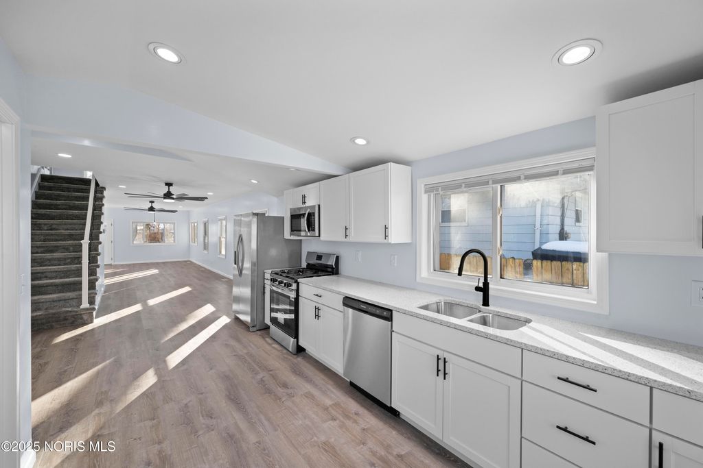 This fully renovated 3-bedroom, 2 full-bath home offers modern updates throughout, including new furnace, central air, new roof on the home and garage, new windows, and all-new finishes. Enjoy an open, bright layout with new flooring, recessed lighting, and a beautifully updated kitchen with stainless steel appliances. Both bathrooms feature fresh tile and contemporary fixtures. Upstairs offers a spacious bonus bedroom or flex space. Located within walking distance to peaceful water views, this move-in-ready home is a must-see!