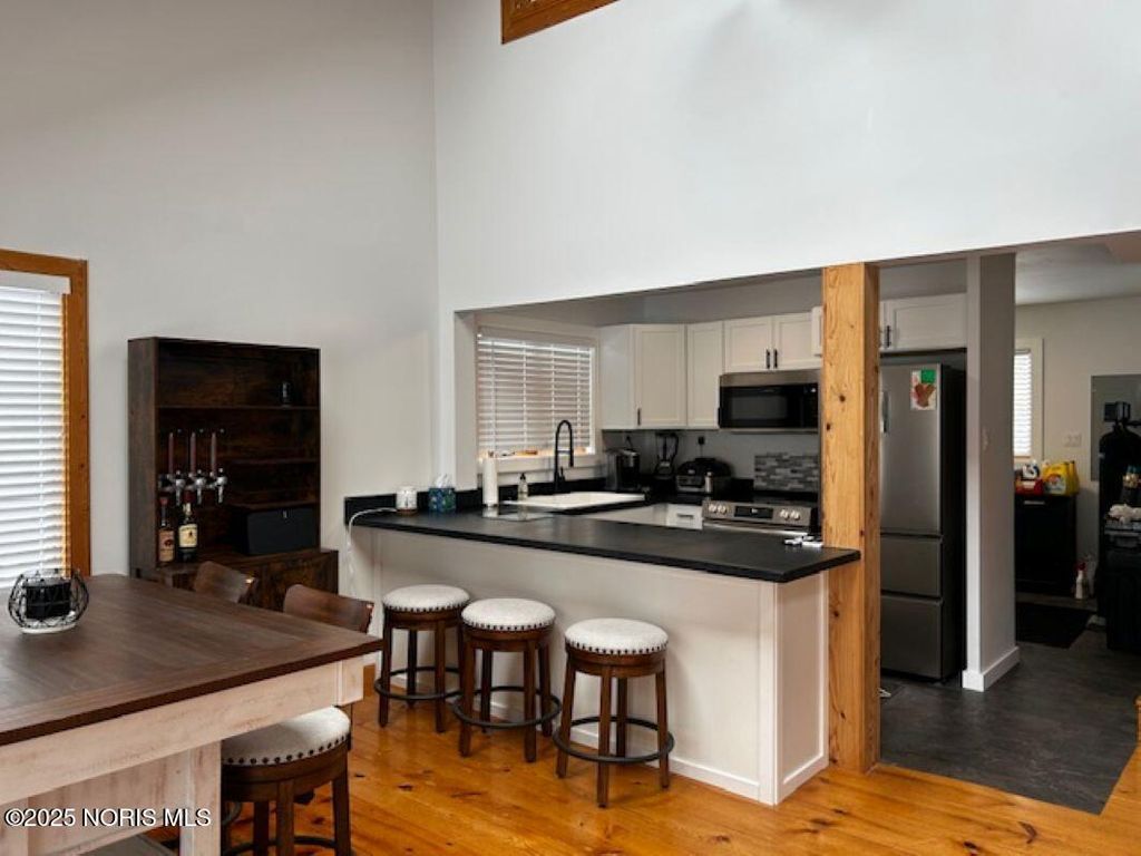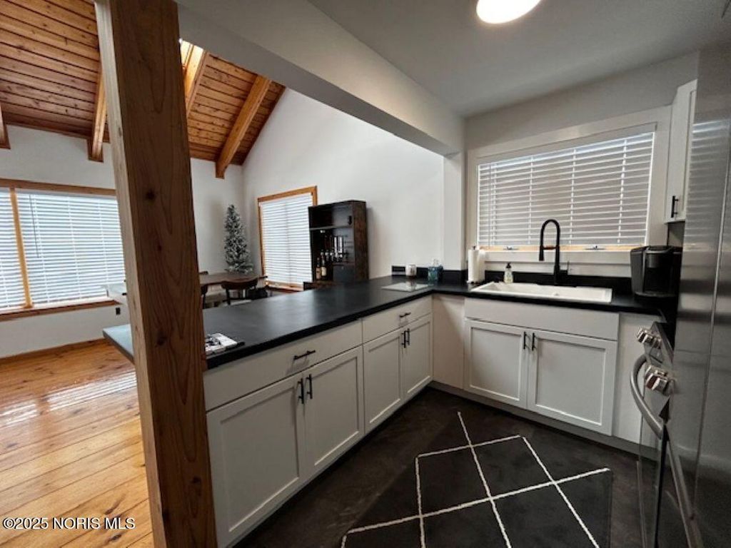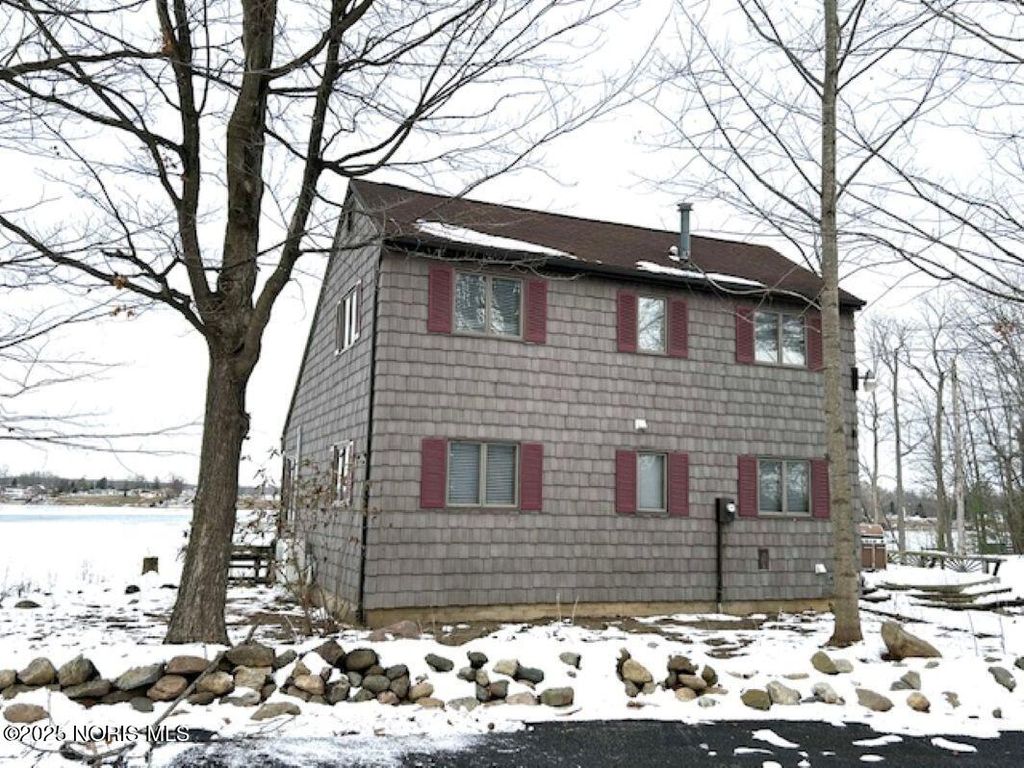 Enjoy the fabulous views all seasons of the year! Great location w/ 5 lake front lots. Beautifully updated throughout with new kitchen including cabinetry, countertops, sink, faucet, stainless steel appliances and flooring. Lots large dining and snack bar plus spacious dining area for gatherings. First floor bedroom, two upper bedrooms and two full remodeled baths with walk in showers gives you all you want. Great room has charming cathedral pine ceilings and pine plank flooring. Full windows across the back of home gives you views of the lake and wooded private lots. Wood burning stove in great room for cozy evening while watching the snow fall. So much has been done to make this a place to love. More conveniences includes a fully equipped 1st floor laundry room, new on demand water heater and newly paved asphalt drive and parking area. Extra lot with home offer plenty of space for family and friends to pull in and park or could be split off and sold as building lots. Call to schedule your private viewing of this home. Peaceful relaxation and tranquility can be yours to enjoy!