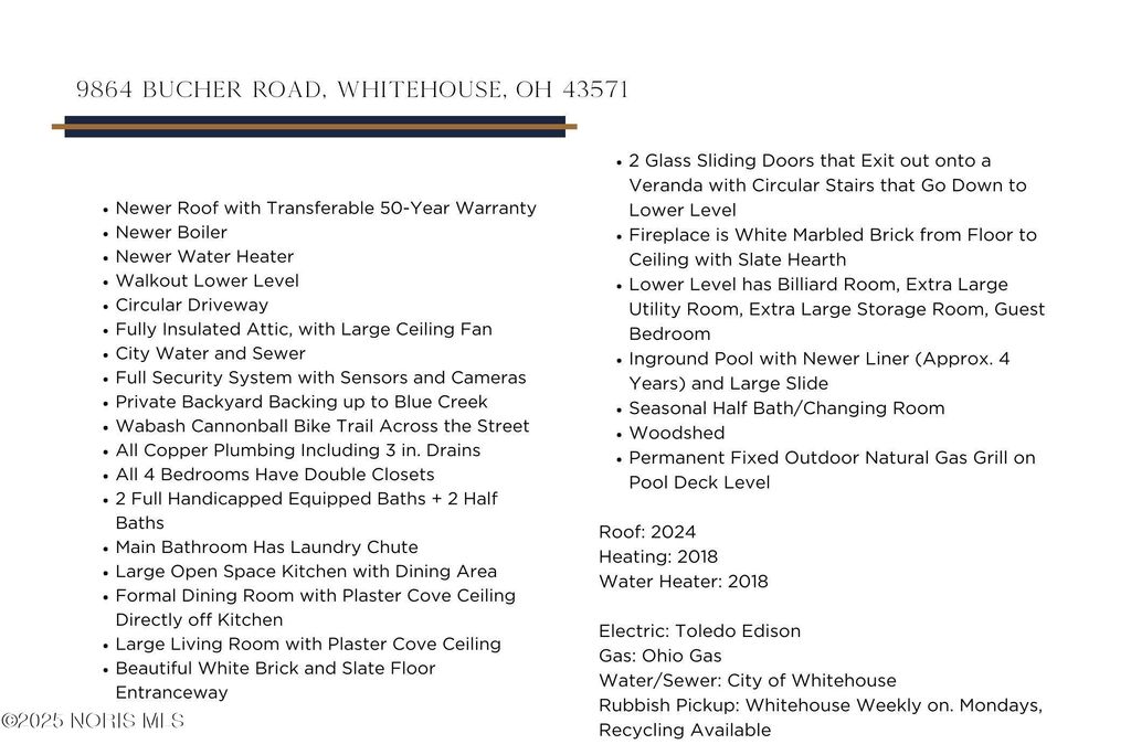 This extraordinary home offers a rare blend of timeless craftsmanship and a setting that feels like a private retreat. From the moment you arrive via the circular driveway, the white brick and slate entrance makes a striking first impression"”elegant, welcoming, and rich in character. Inside, gracious living spaces unfold with plaster cove ceilings in both the formal dining room and expansive living room, creating an atmosphere of classic sophistication. The open kitchen and dining area invite connection, while large glass sliders lead to a veranda overlooking the backyard and Blue Creek beyond"”perfect for morning coffee or evening gatherings as nature surrounds you. The walkout lower level is designed for entertaining and relaxation, featuring a billiard room, guest bedroom, generous storage, and access to the backyard oasis. Outside, the inground pool with a newer liner, slide, seasonal changing bath, and permanent natural gas grill create a resort-like setting where summer memories are made. Comfort and peace of mind are built in, with a newer roof carrying a transferable 50-year warranty, newer boiler and water heater, fully insulated attic, copper plumbing throughout, city water and sewer, and a full security system with sensors and cameras. All four bedrooms offer double closets, and two full handicapped-equipped baths ensure accessibility and ease. Backing up to Blue Creek and located directly across from the Wabash Cannonball Bike Trail, this home offers a rare lifestyle"”where privacy, recreation, and classic elegance come together in perfect harmony.