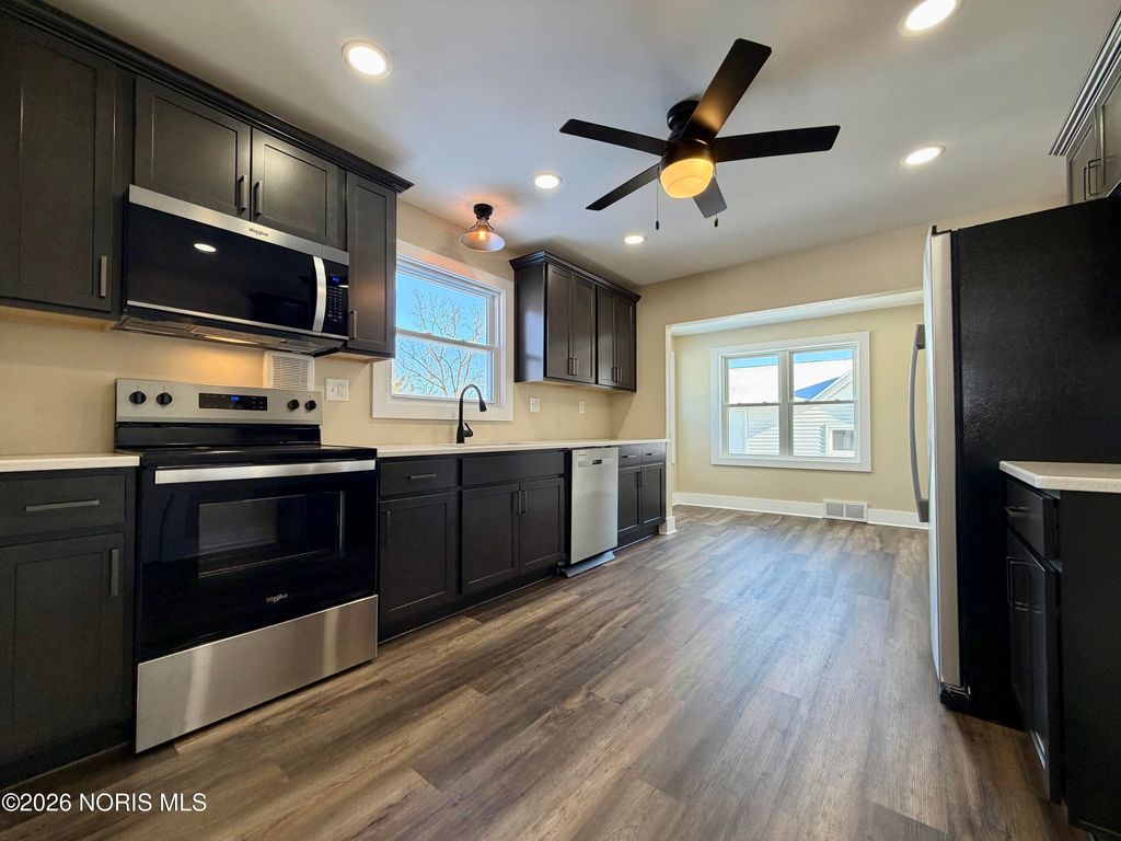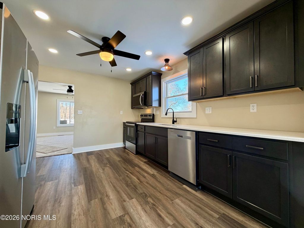 Welcome to this beautifully remodeled farmhouse nestled on 4 picturesque acres with wooded trails throughout. The entire main level has been taken down to the studs and completely refurbished with new floors, drywall, lighting, and modern finishes, offering peace of mind and timeless style. This 3-bedroom, 1.5-bath home features a fully remodeled kitchen with quartz countertops, soft-close cabinetry, and all-new stainless steel appliances. Extensive updates include new windows and doors, updated wiring and lighting, new ductwork, a new A/C unit, new carpet upstairs and down, and durable vinyl flooring throughout. The spacious primary suite is a true retreat, featuring a fully remodeled bathroom with a standalone shower, jetted tub, and generous space. A convenient laundry chute connects the primary bathroom directly to the laundry room. The home also offers a partial basement with updated lighting and a dedicated cold storage area. Additional highlights include city water and sewer, an owned propane tank, and an attached oversized 4-car garage. The impressive detached building offers endless possibilities, with a large garage on the lower level and an expansive upper level ideal for a game room, man cave, workshop, studio, or business space. Surrounded by nature yet offering modern comforts, this one-of-a-kind country property is ready to be your next home. Don't wait"”schedule your showing today and experience everything this exceptional property has to offer!