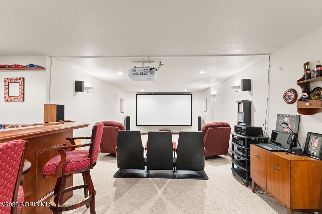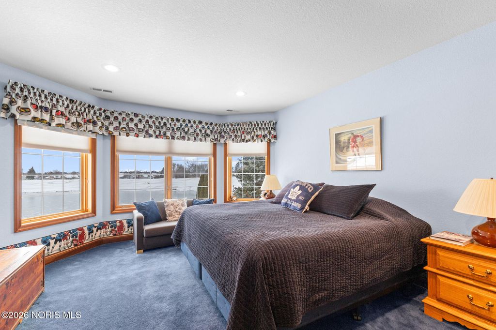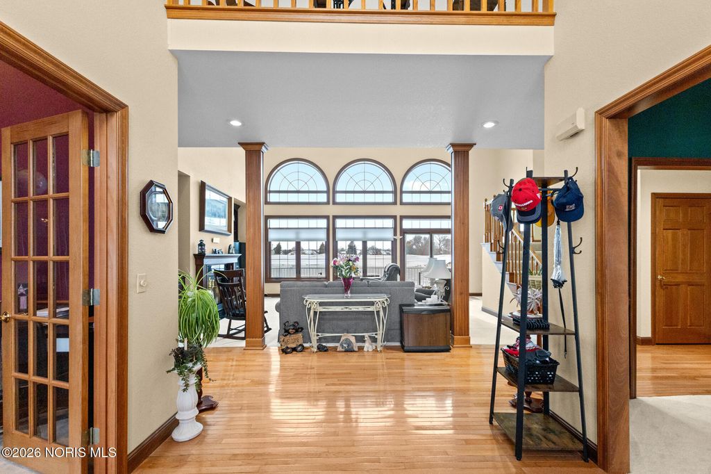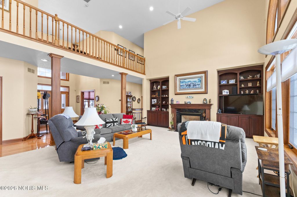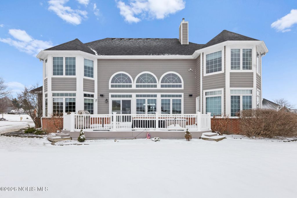 Beautiful custom home on the 12th hole and overlooking a pond in Stone Ridge Golf Course! Current owners have updated many things to enjoy! Finished basement with 1,200 square feet and boasts of a Theatre room with seating and a high definition projector --updated with 7.1 channel with HDMI. Half bath and separate "bedroom" space also in basement. The first and second floors have over 3,800 square feet of living and include huge rooms and closets, main floor master and ensuite, 3 additional bedrooms (totaling 4 plus room in basement), family room with vaulted ceiling and fireplace; custom kitchen with newer countertops and private office space/den. Roof replaced in 2025. Hot water tank '23; added insulation in attic '24; exterior painted '22; two furnaces and A/C units in '17; deck retrofit ' 19; updated master bath '20; and much more. Move right in and enjoy this home year round!