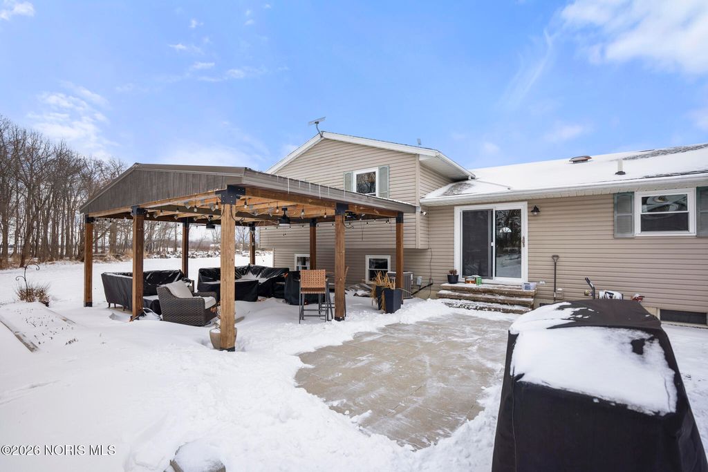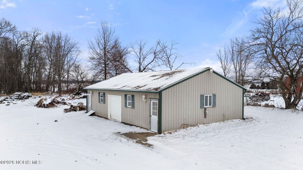 Welcome to your own private slice of country paradise! This spacious 4-bedroom, 2-bath home sits on 5 scenic acres and offers the prefect blend of comfort, function, and outdoor living. The property features 2 heated pole barns, ideal for storage, hobbies, livestock, or equipment, plus a beautiful, stocked pond with the ability to pull water directly from the pond-a rate and valuable feature! Enjoy peaceful views from the brand-new patio and covered porch (2025), perfect for relaxing or entertaining year-round. Inside, the home is equipped with all new appliances and a wood burner for cozy winters. Enjoy peace of mind with the many updates including (2025) media wall with fireplace, (2024) outdoor pergola with roof, (2023) outdoor heat master wood burner, sump pump, kitchen remodel and appliances, (2022) water softener, flooring and carpet, (2021) well and overhead garage doors, (2020) furnace/ac, triple pane windows, (2017) roof.