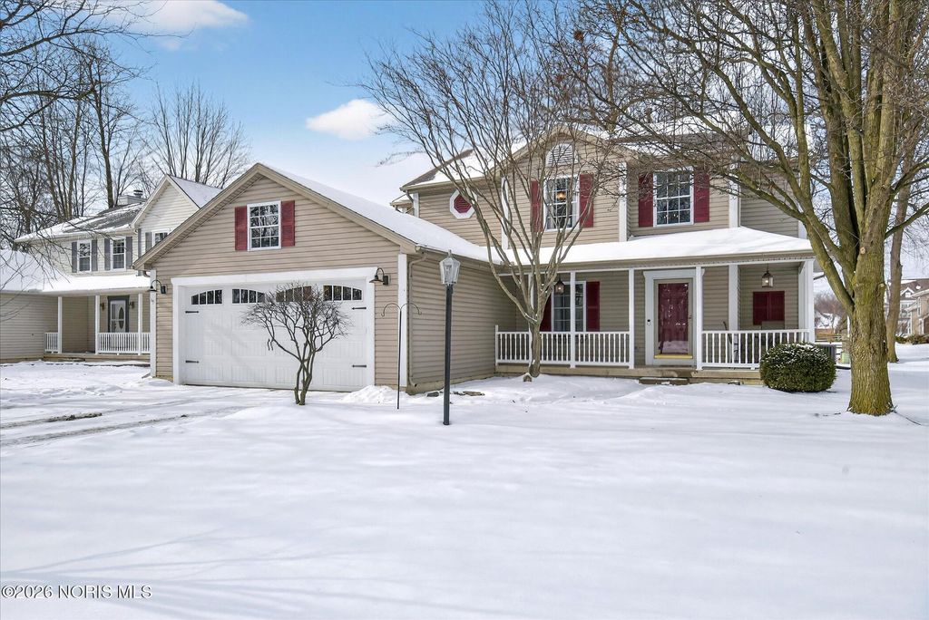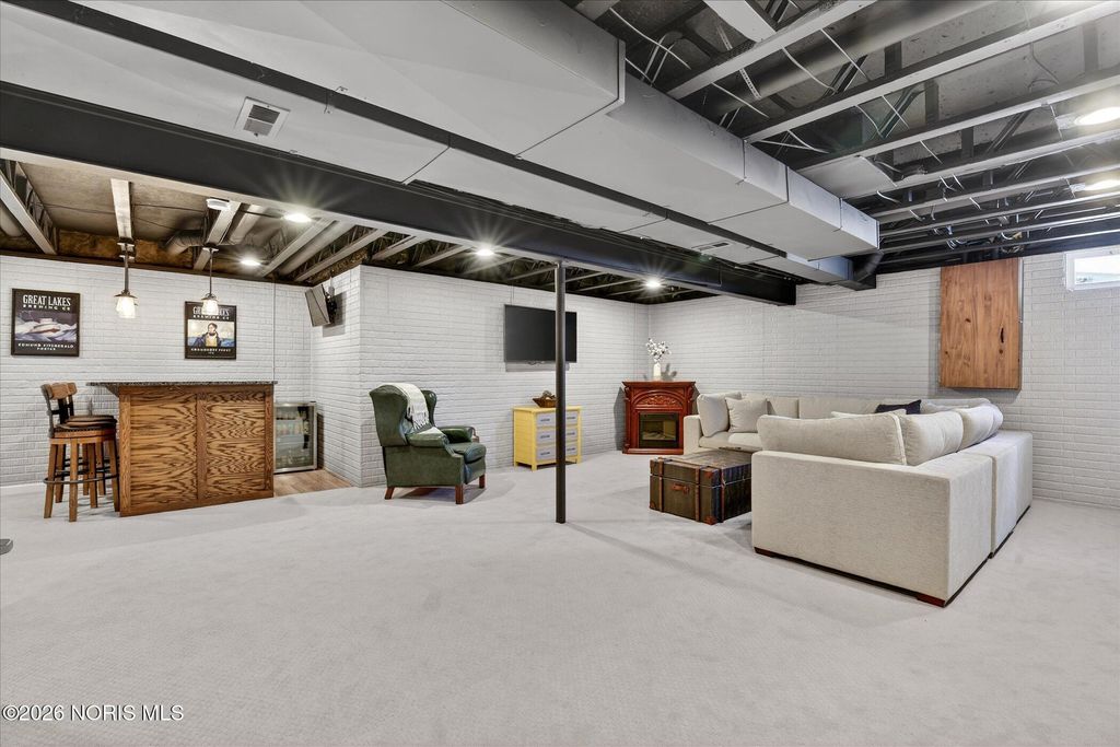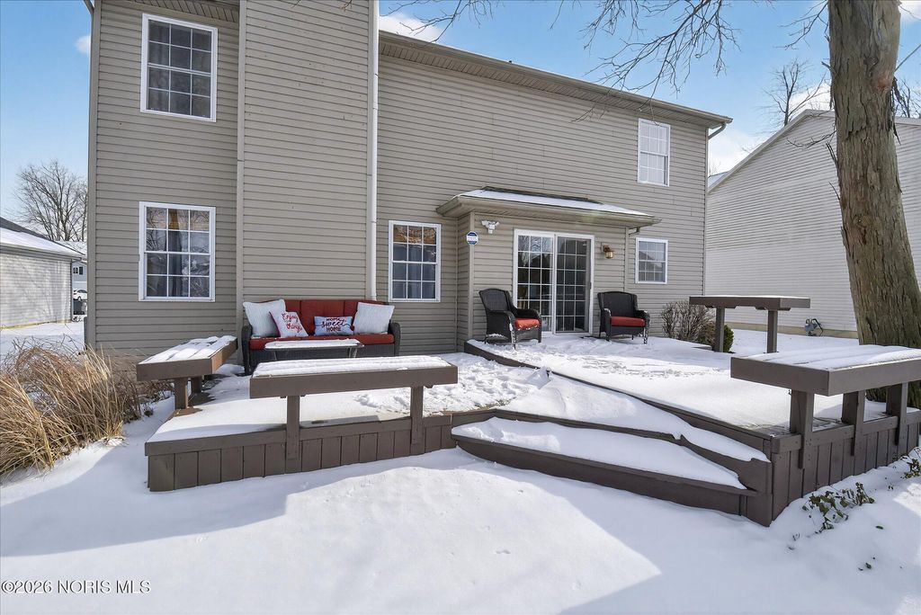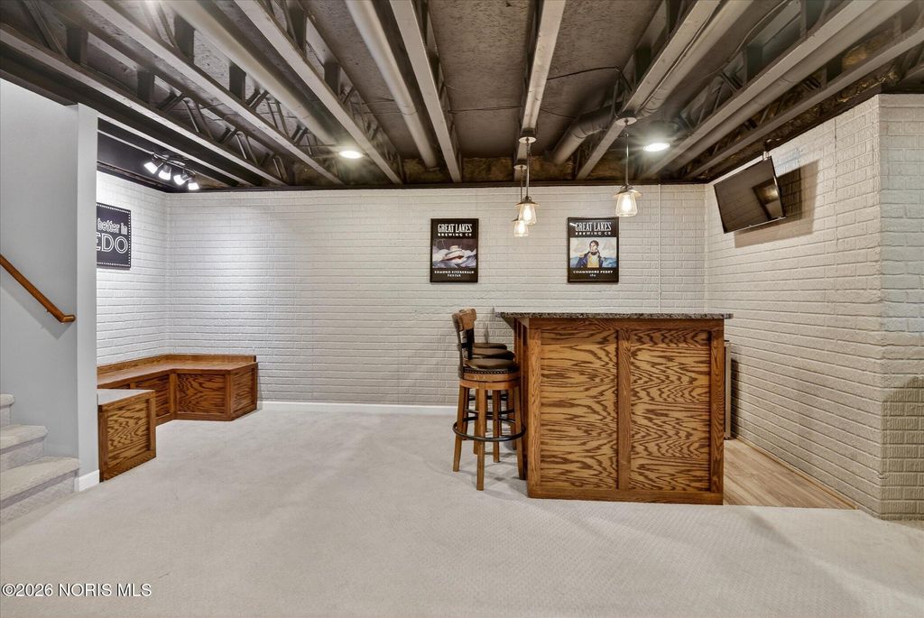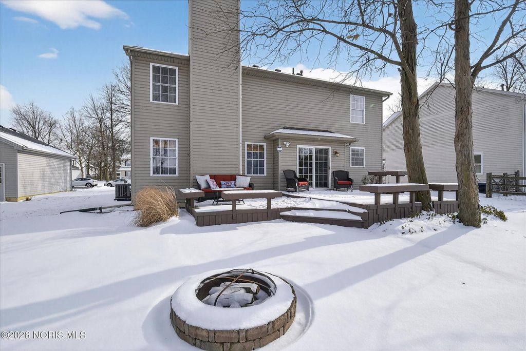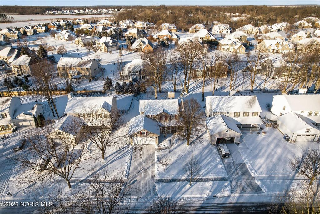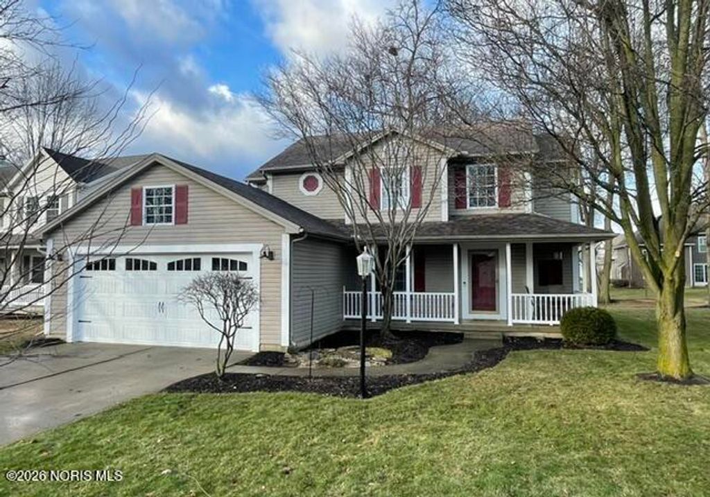 This distinctive Perrysburg home is nestled in an absolute beloved and quiet cul-de-sac. Three bedrooms all feature a private ensuite full bathroom and a walk-in closet. The design does not skimp on size, as the secondary bedrooms are notably larger than standard. A bright kitchen with a large island provides ample counter space, extra seating and is open to the dining area and living room that features a floor to ceiling stone fireplace. Updated modern half bath and laundry room are situated off the kitchen. The main floor also features a charming reading or sitting room. What will feel like unlimited space in the finished modern basement features a built-in dry bar with granite counter tops, beverage fridge, built-in wooden seating and shelving. Abundant open space for your own movies, games, etc. The mechanical room provides extra storage and workbench. A large two-tiered deck, backyard patio and firepit is an outdoor oasis surrounded by mature trees and ample summer shade. The ultimate bonus is a finished and insulated gas heated garage, extra deep for generous storage and a pedestrian door to the yard. All this in close proximity to schools, parks and Levis Commons. No HOA! Updates include HVAC '24, finished garage with 50,000 BTU gas heater, new modern insulated garage door, over 750 sq/ft of finished basement space, new 1st floor carpet, new electrical and lightning upgrades, 30 AMP EV charging, Owens Corning roof w/ transferable warranty '16.