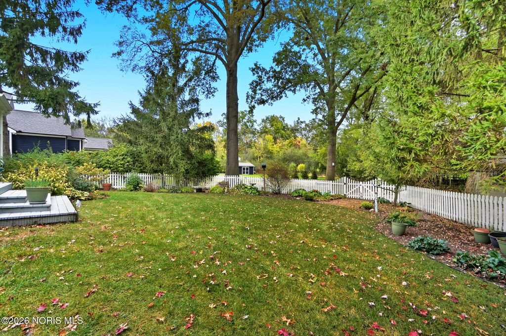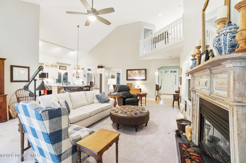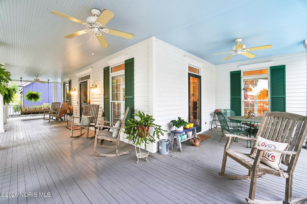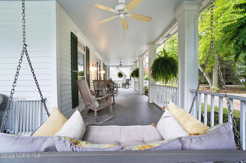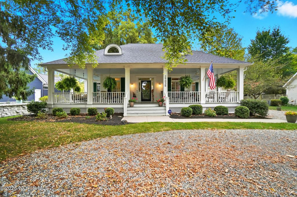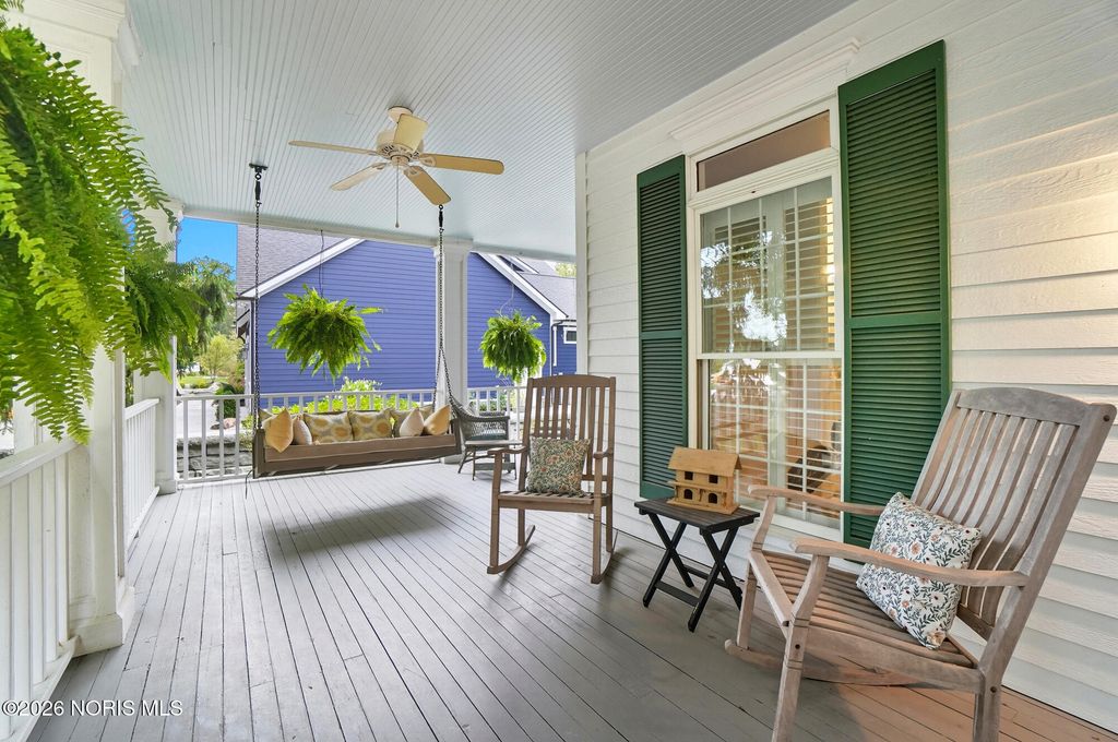 One of a kind Southern colonial featuring a welcoming wrap-around front porch, perfect for morning coffee, and lazy evenings. Inside, enjoy hardwood floors, high ceilings, and timeless character at every turn. A beautiful vaulted foyer, hardwood staircase and dining room with access to the wrap-around porch greet you as you enter the front door. The open great room and kitchen feature soaring ceilings and a gas fireplace with a wood mantle dating back to 1792. French doors lead to the backyard, featuring a deck, a fenced garden area surrounded by mature landscaping, a fire pit, and a shed. Beyond, a wooded bck lot offer privacy and a natural setting where wildlife is frequently seen. The first floor primary suite is filled with natural light from the gorgeous windows overlooking the private yard. The primary bedroom also features a tray ceiling, hardwood floors, a walk-in closet, and an updated bathroom. A second first floor bedroom or optional den has hardwood, built-ins, and an adjacent full bathroom. There is a huge basement which provides endless storage or future living space. This home is rich in charm, thoughtfully designed and truly one of a kind. Upstaris offers two additional bedrooms and a Jack and Jill bathroom