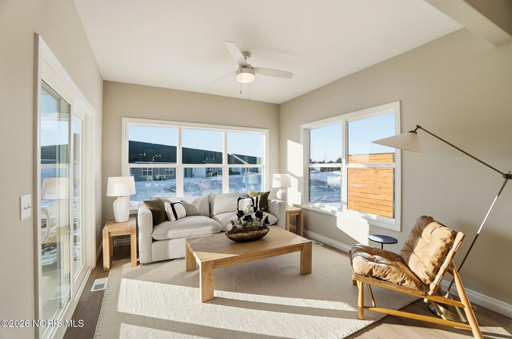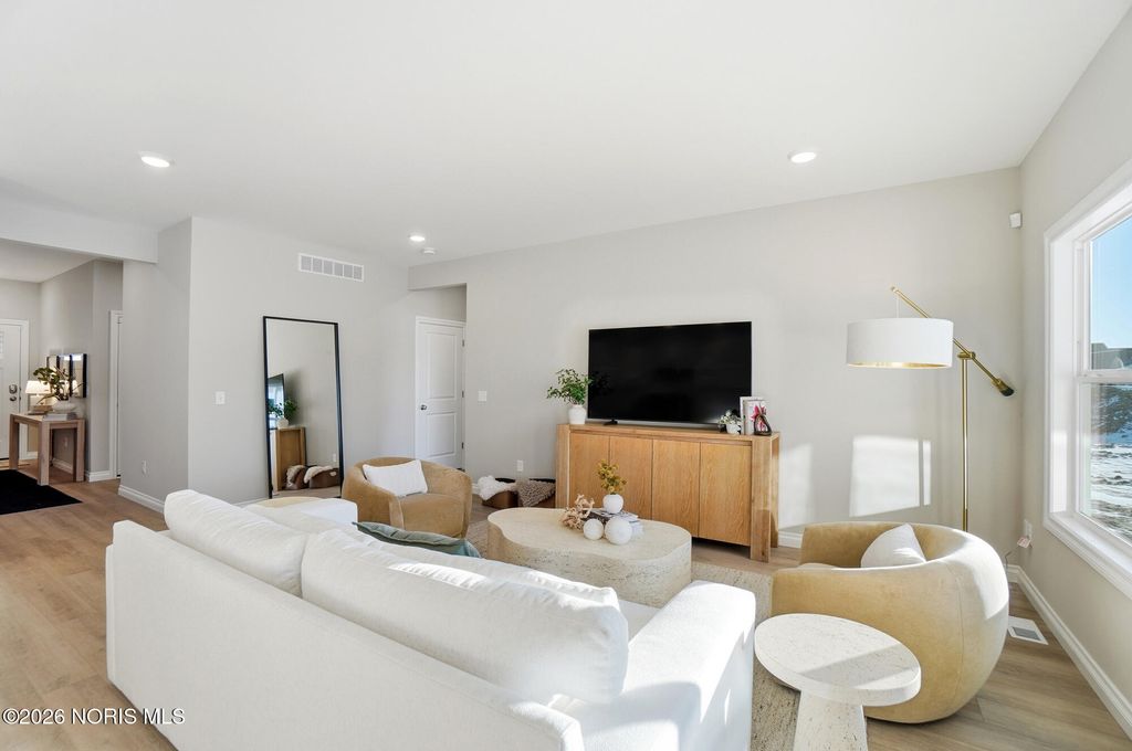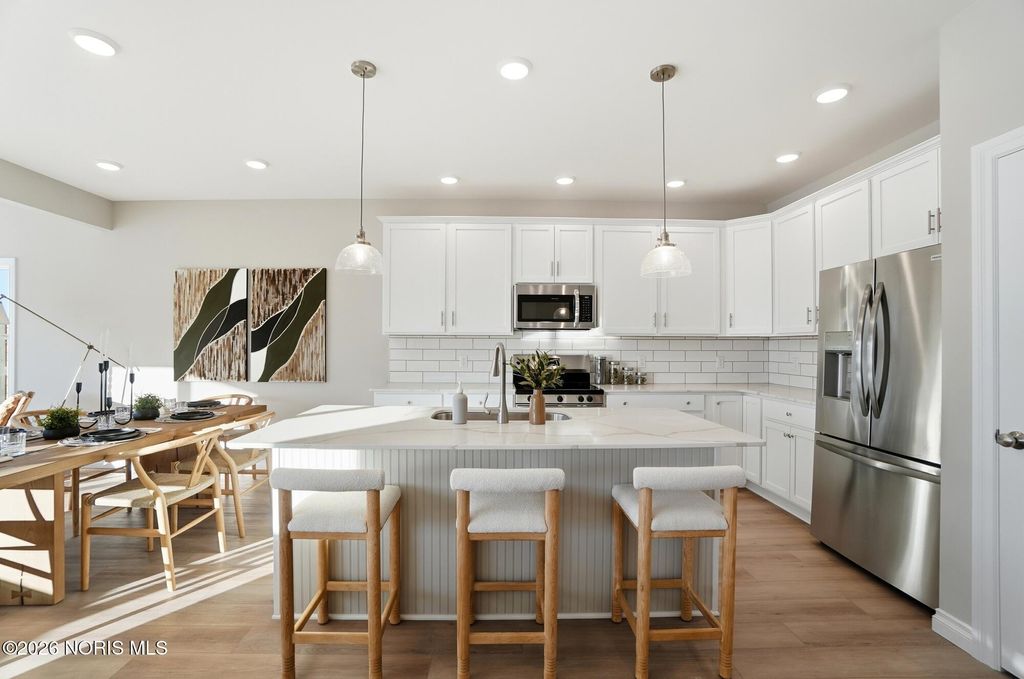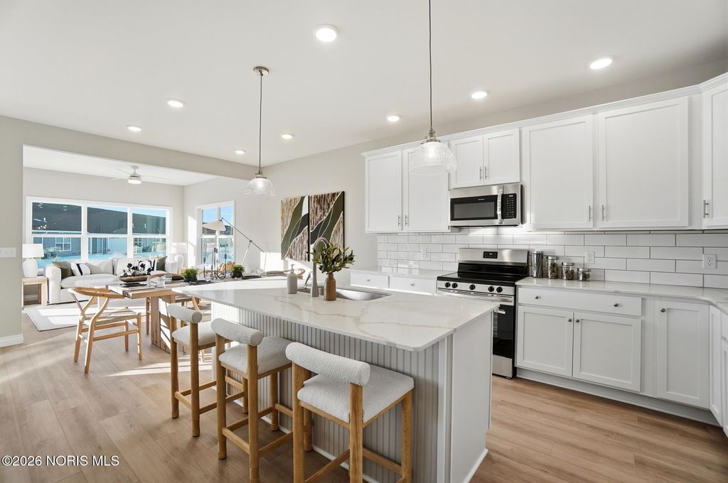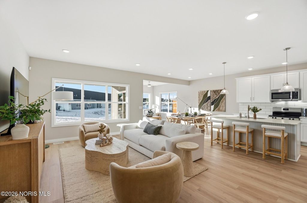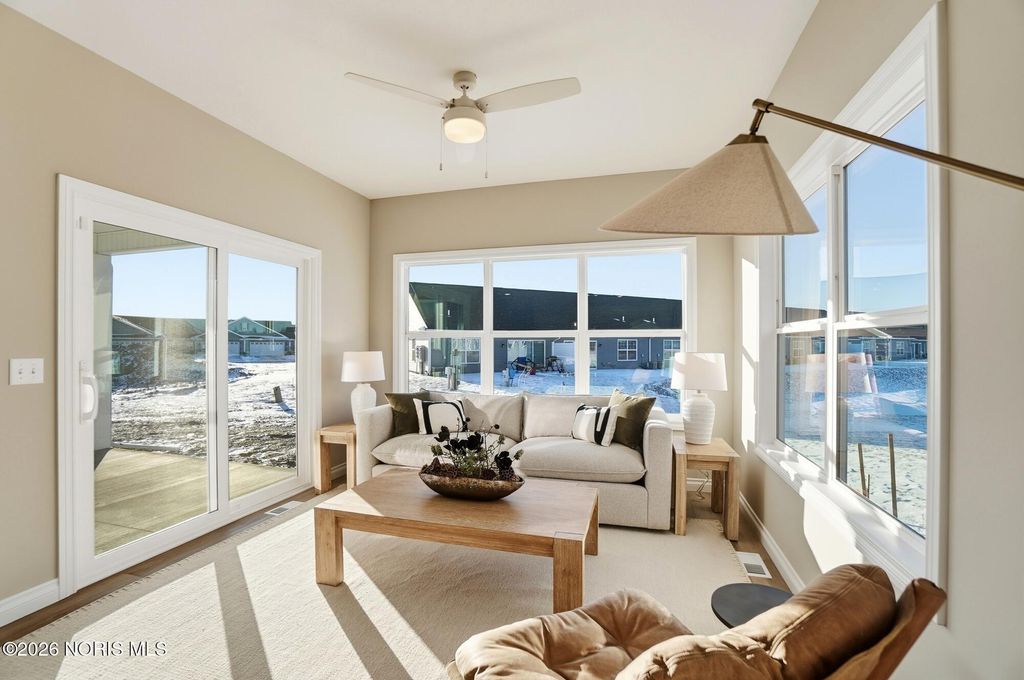 MODEL HOME by MR DEVELOPERS at THE FALLS AT RIVERS EDGE. Price shown based on Builder's upgraded features, including lot. This home is NOT for sale. The Villa features an open great room floor plan with 9' ceilings throughout the home. Shaker-style cabinets, quartz countertops, attractive luxury vinyl plank flooring, a bright sunroom, and a covered rear porch. Enjoy a spacious primary bedroom with an ensuite bath and large walk-in closet, an upper-level loft with a closet that could be used as a 3rd bedroom that walks into floored attic storage space, a main floor laundry, and a 2-car garage. HOA maintains lawn & snow for low maintenance lifestyle and also includes access to a clubhouse and outdoor pool.