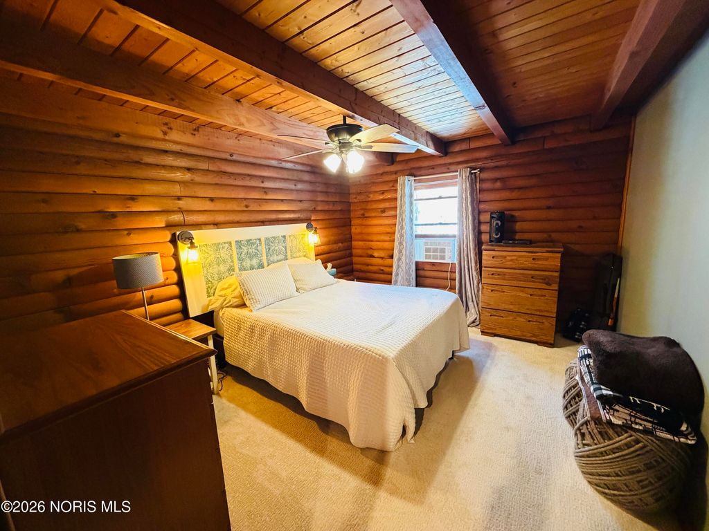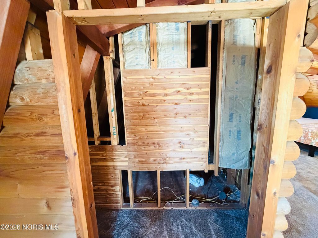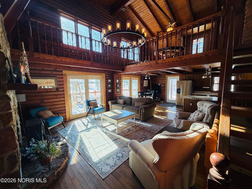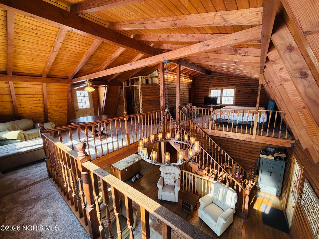 Nestled on 7 peaceful, wooded acres, this inviting log cabin offers the perfect blend of rustic charm and privacy. The home features 2 bedrooms and an open-concept living area that showcases the warmth and character of log construction. A wrap-around front porch invites you to relax and enjoy the natural surroundings, while a winding driveway sets the tone for this secluded retreat. Large full bath on main floor, and a "ready to be remodeled" , plumbed space in loft for an additional full bathroom. Additional highlights include a full basement offering storage or future finishing potential. Ideal for those seeking a quiet country escape with timeless appeal. Enjoy the The detached 25x30 garage and 14x40 animal barn with fenced in small pasture line the driveway.