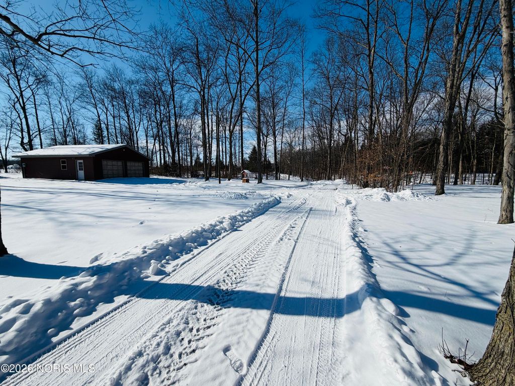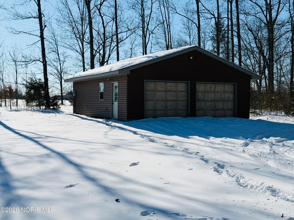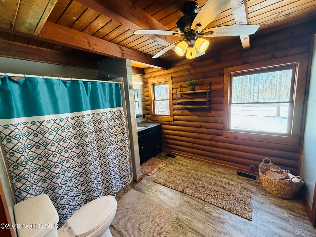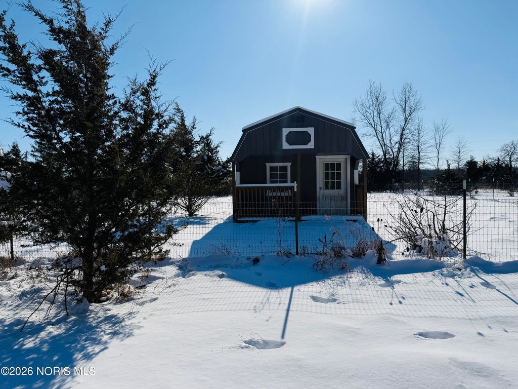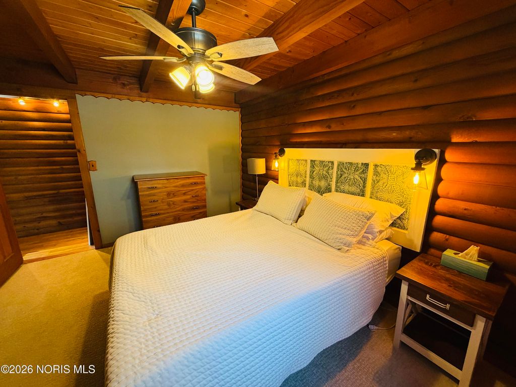Nestled on 7 peaceful, wooded acres, this inviting log cabin offers the perfect blend of rustic charm and privacy. The home features 2 bedrooms and an open-concept living area that showcases the warmth and character of log construction. A wrap-around front porch invites you to relax and enjoy the natural surroundings, while a winding driveway sets the tone for this secluded retreat. Large full bath on main floor, and a "ready to be remodeled" , plumbed space in loft for an additional full bathroom. Additional highlights include a full basement offering storage or future finishing potential. Ideal for those seeking a quiet country escape with timeless appeal. Enjoy the The detached 25x30 garage and 14x40 animal barn with fenced in small pasture line the driveway.