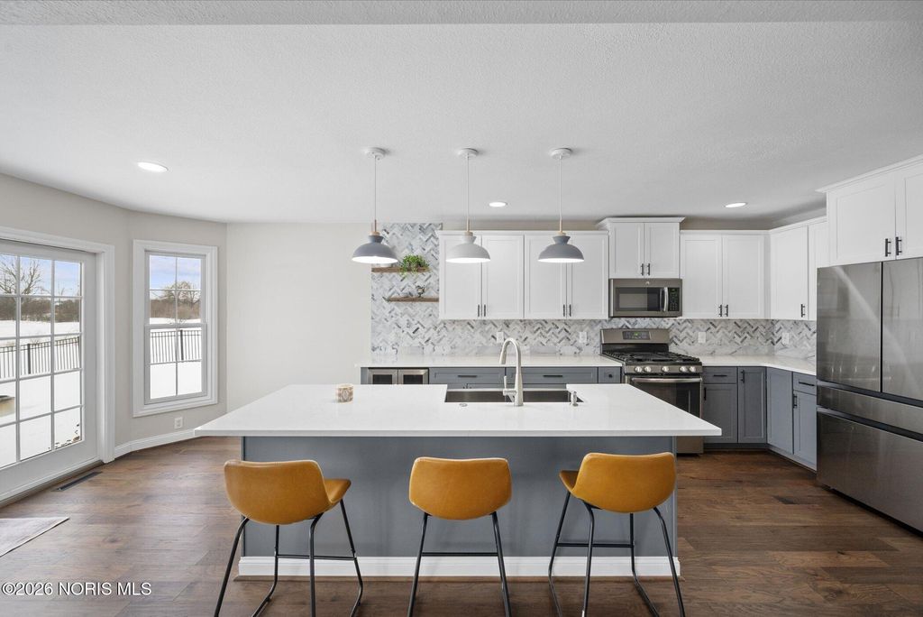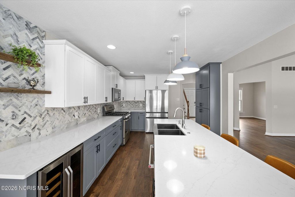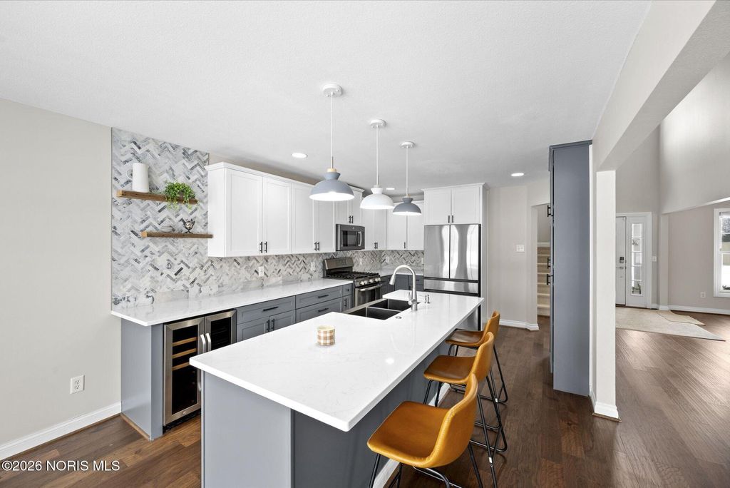 Unique features, natural light and high ceilings will greet you upon entering. Primary 1st floor suite features new vanity, separate tub and shower, and huge walk in closet with built ins. The newly updated kitchen will delight the cook in the family with open concept, new cabinets, counters, floor, SS appliances and even a wine cooler. Lots of additional storage. The rear yard is enclosed by a decorative iron fence and backs up to a secluded and peaceful pond and undisturbed wildlife habitat. This is all located in the Anthony Wayne school district and can be yours! Call for a private tour or get one set with your favorite agent.