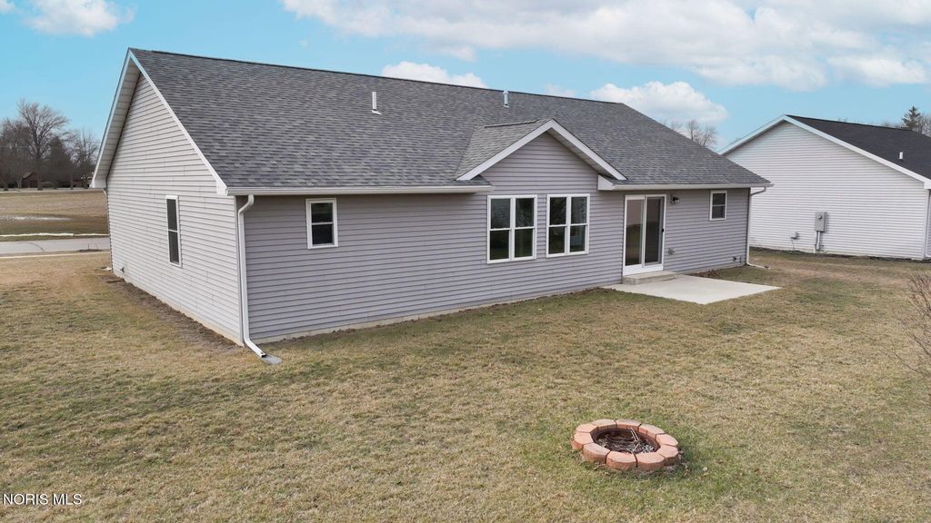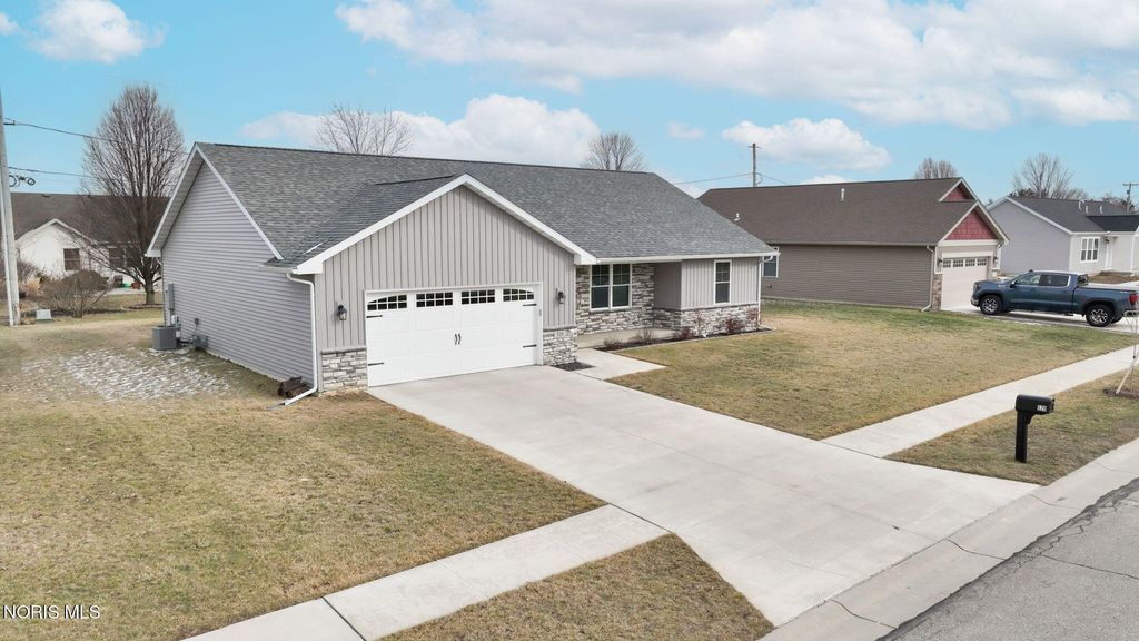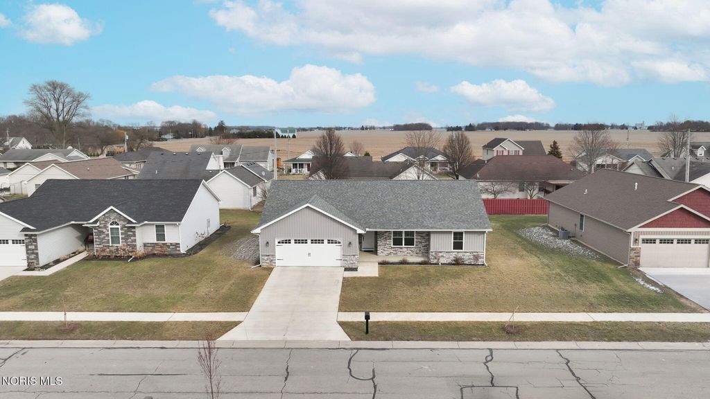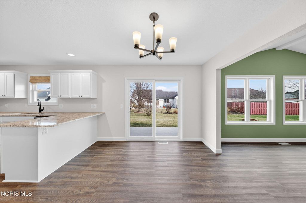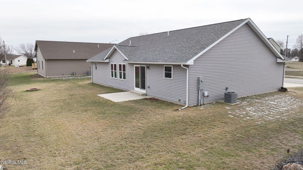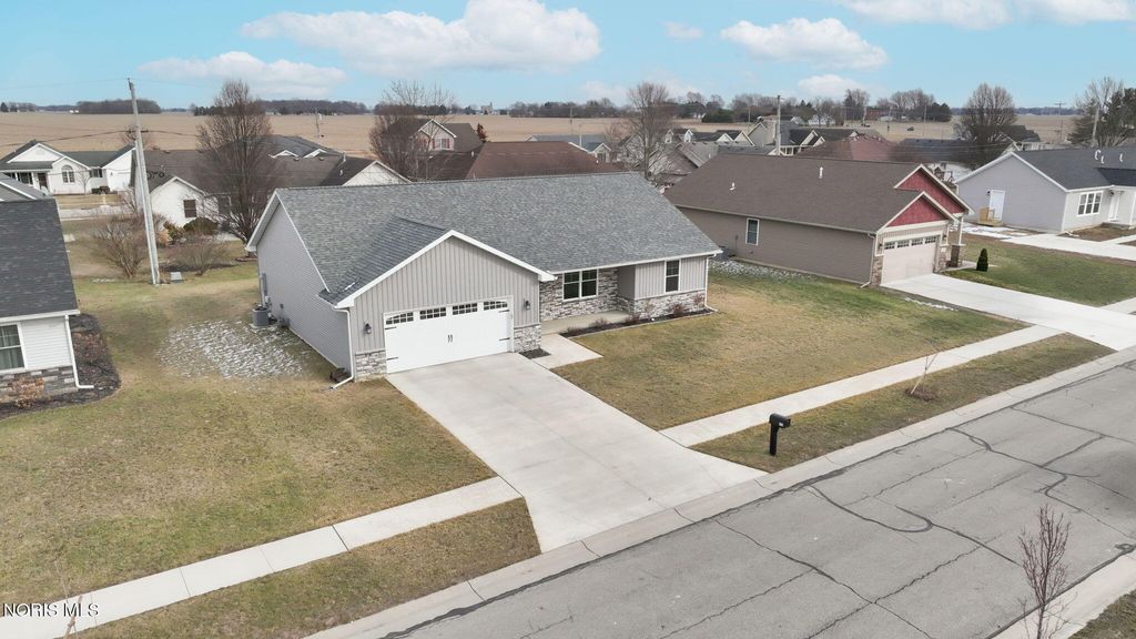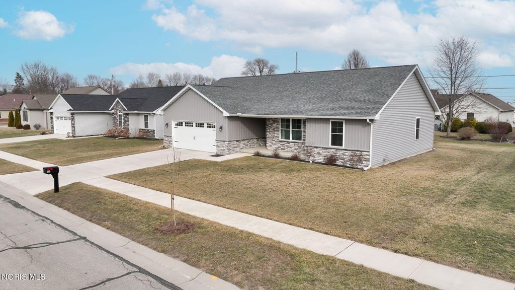 Newer construction ranch in an established neighborhood featuring an open-concept layout with vaulted ceilings. The kitchen offers white cabinetry, stainless appliances, and a large island that flows into the dining area with sliding doors to the backyard. The primary suite includes a walk-in closet and private bath, while additional bedrooms offer flexible space for guests or office use. Convenient main floor laundry and ample storage throughout. Move-in ready with modern finishes and a functional layout.