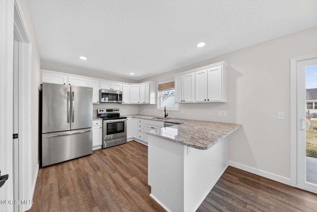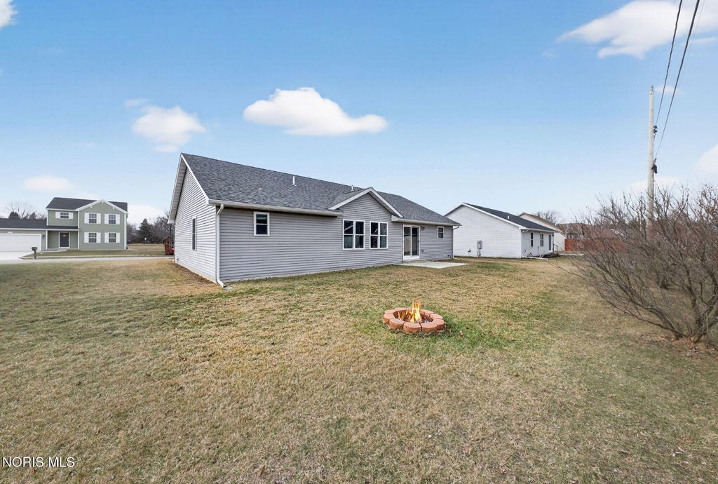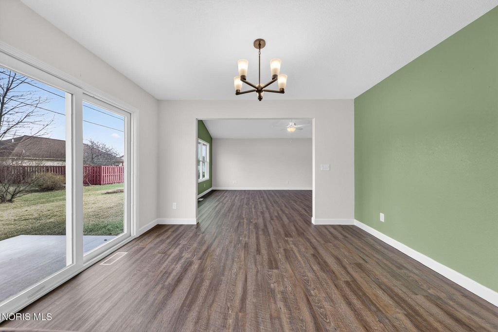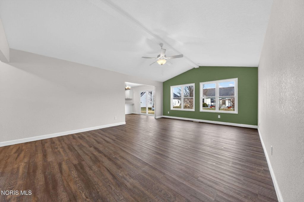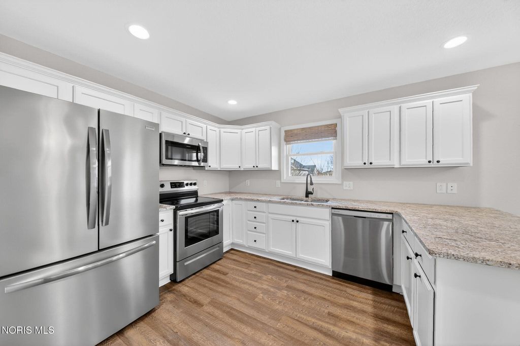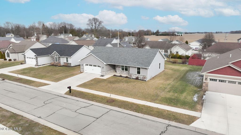 Newer construction ranch in an established neighborhood featuring an open-concept layout with vaulted ceilings. The kitchen offers white cabinetry, stainless appliances, and a large island that flows into the dining area with sliding doors to the backyard. The primary suite includes a walk-in closet and private bath, while additional bedrooms offer flexible space for guests or office use. Convenient main floor laundry and ample storage throughout. Move-in ready with modern finishes and a functional layout.
