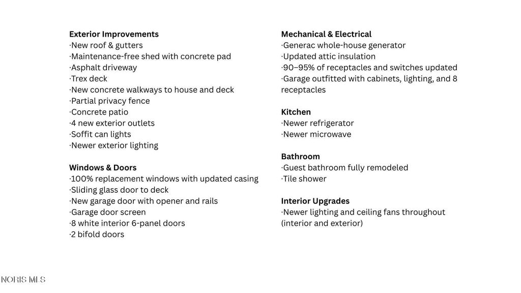 This meticulously maintained home reflects approximately $125,000 in thoughtful upgrades by long-term homeowners. Major improvements include a newer roof and gutters, Trex deck, whole-house Generac generator, fully replaced windows with updated casing, and a completely remodeled guest bathroom with a tile shower. Step inside and experience the care and pride of ownership throughout, then imagine yourself unwinding on the deck and enjoying the spacious corner lot from your private backyard. Schedule your showing today. This one wont last long!