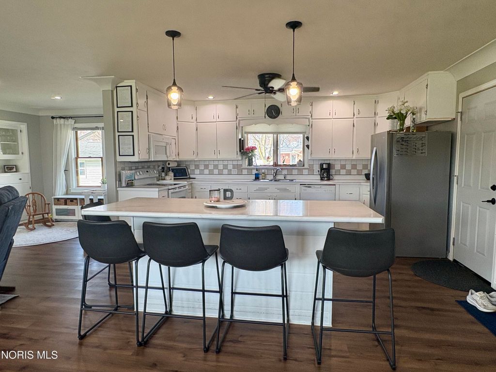 Updated 3-bedroom home featuring a bright open-concept living room and kitchen with a large island, plank flooring, and cozy electric fireplace. Spacious layout perfect for everyday living and entertaining. Includes a full bath plus a convenient half bath in the attached garage. Partially finished basement offers additional living space, office, or playroom. Great curb appeal with mature trees and move-in ready updates throughout!