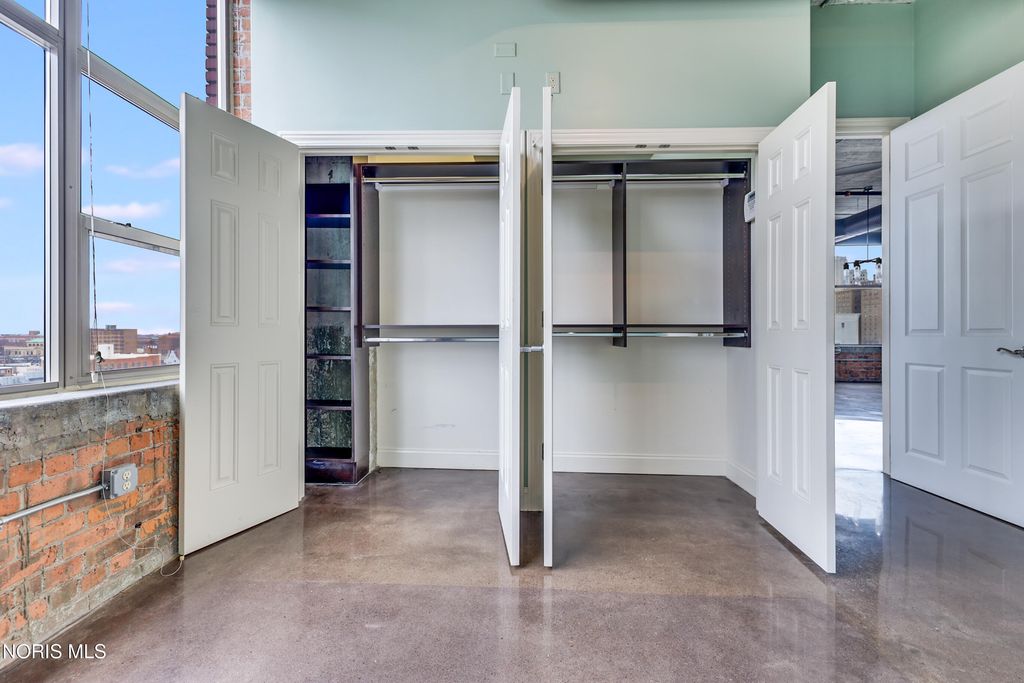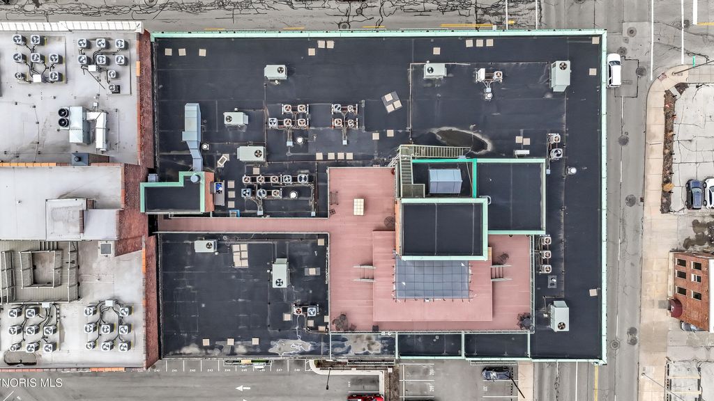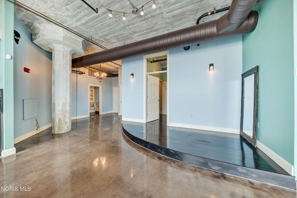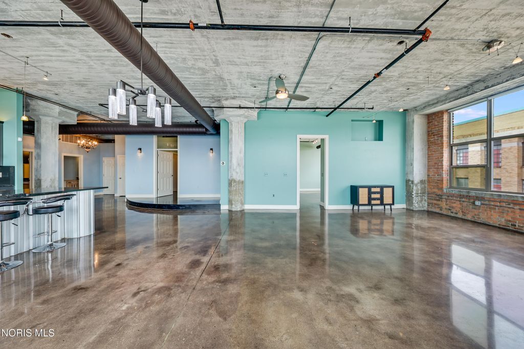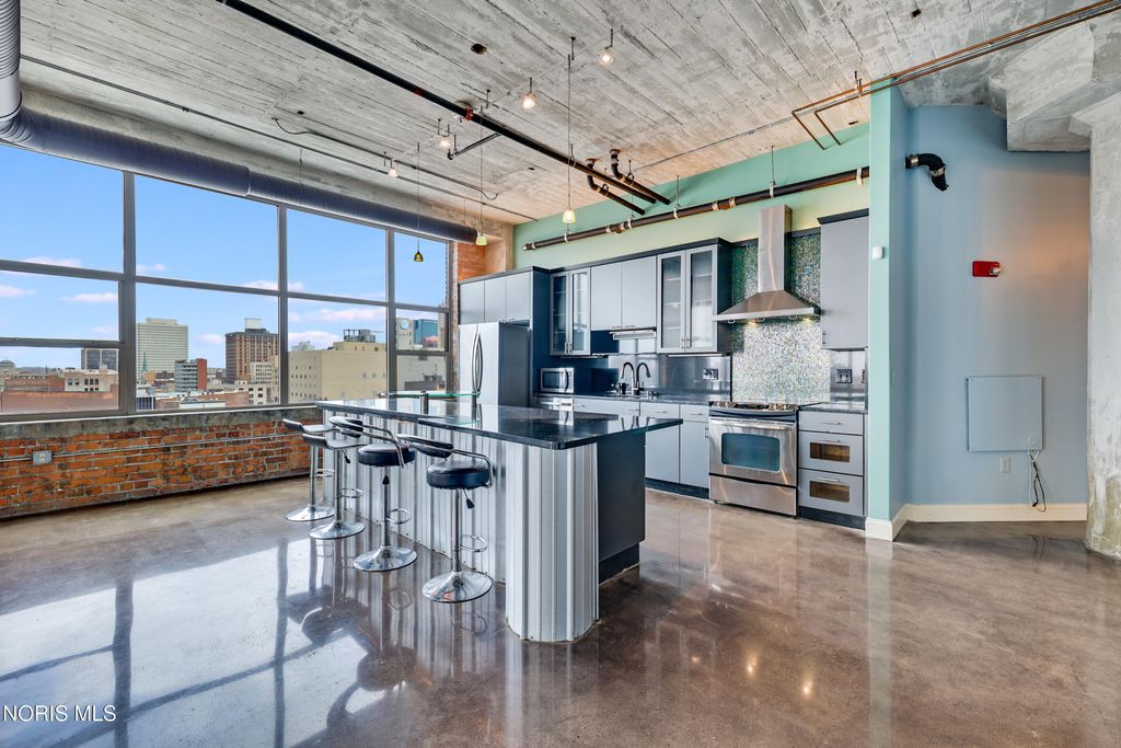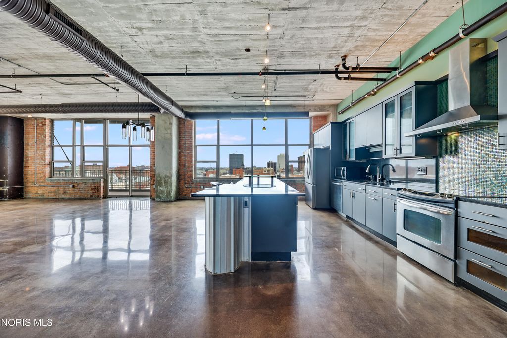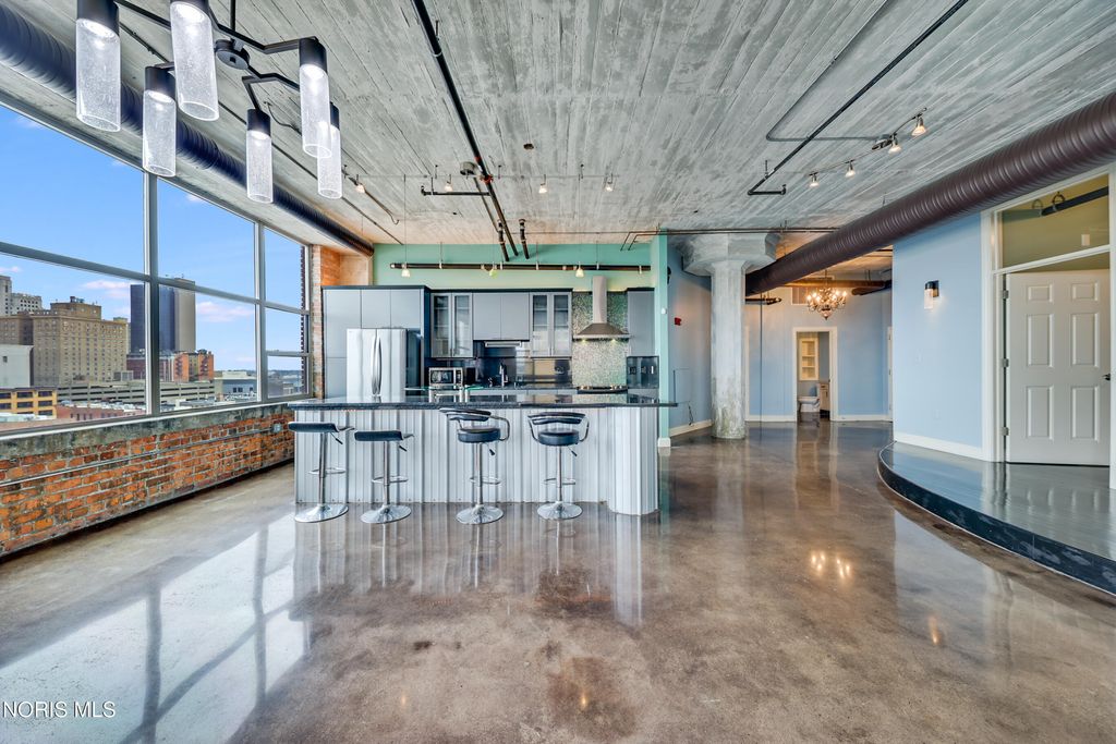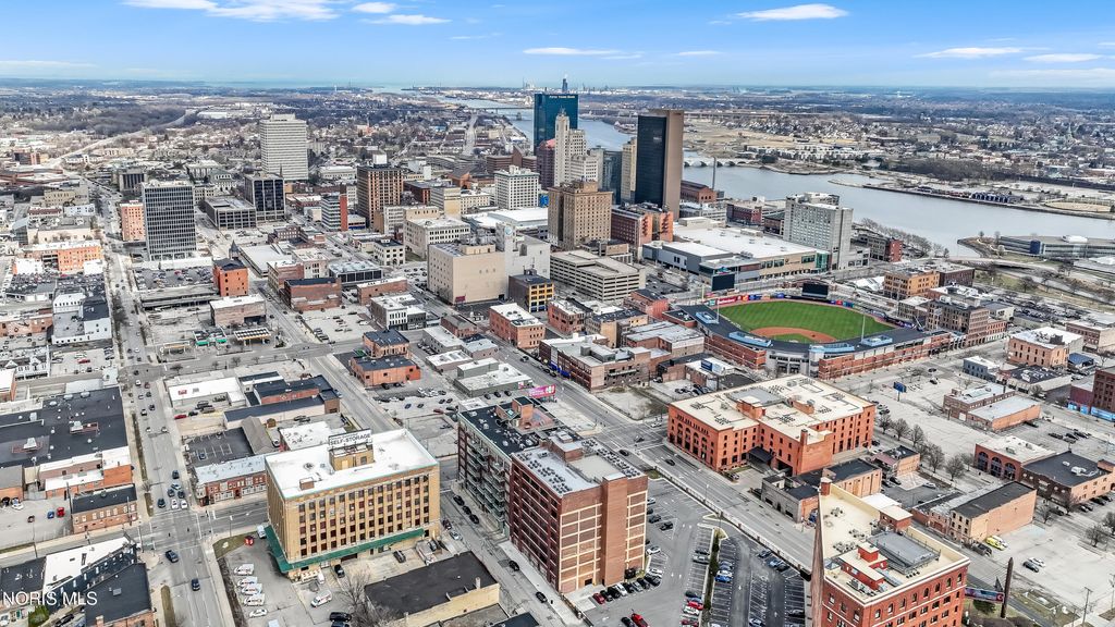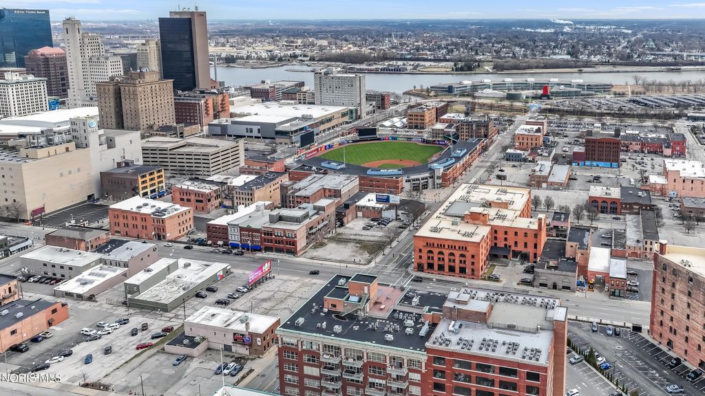 WELCOME TO ELEVATED DOWNTOWN LIVING AT IT'S FINEST! PRIVATE, RESERVED GARAGE PARKING! ROOFTOP POOL! ALMOST 1,800 SF CORNER UNIT! This stunning corner unit at Bartley Lofts offers an unbeatable combination of style, space, and scenery, flooded with natural light from multiple exposures and featuring an open-concept floor plan with breathtaking views overlooking the Mud Hens stadium and the vibrant city skyline. Inside, you?ll find a perfect blend of modern updates and industrial charm, including high ceilings, exposed brick walls, and striking cement pillars that create an authentic loft feel, all complemented by stainless steel appliances, a spacious layout, and extensive built-in