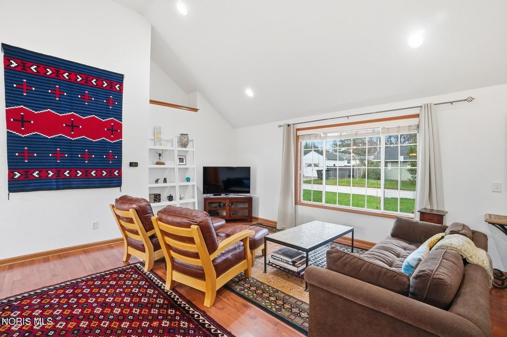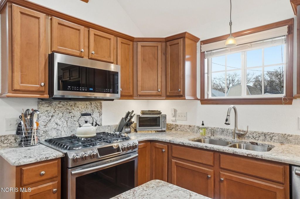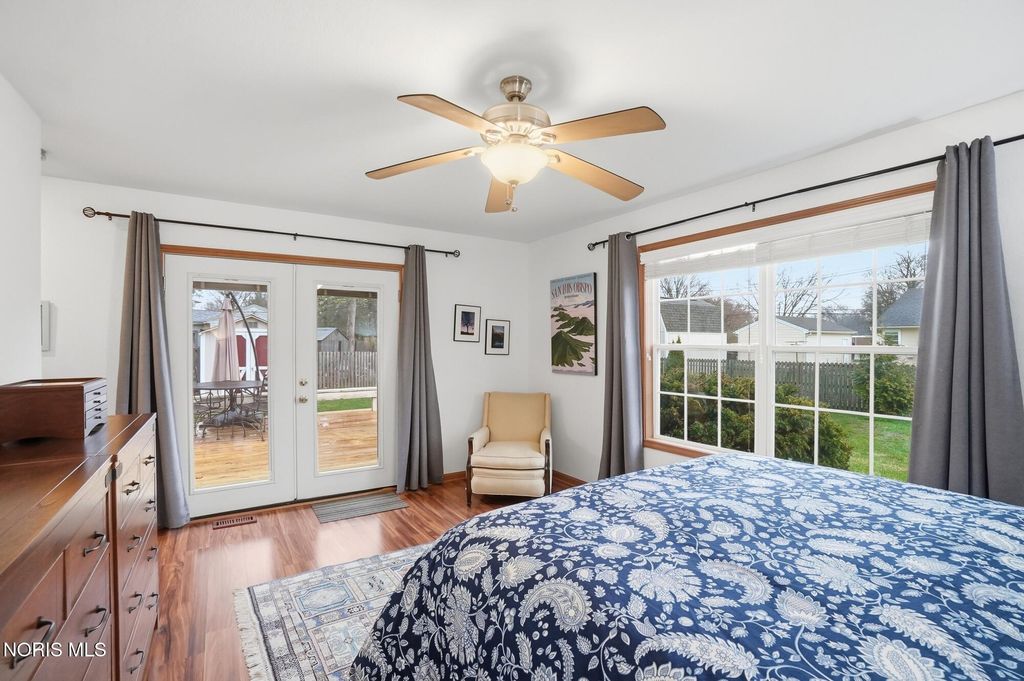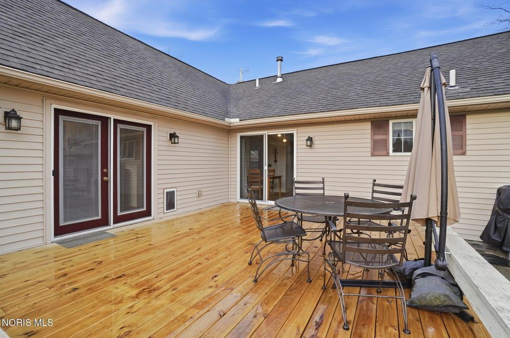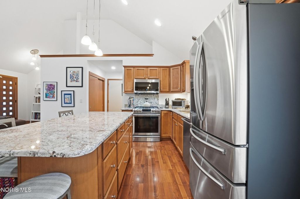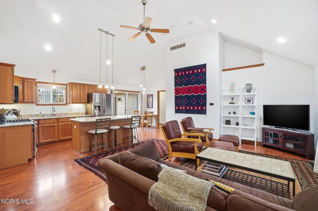 This beautifully maintained home was completely rebuilt on the original foundation in 2006. It offers a light, bright floor plan with vaulted ceilings and numerous windows for tons of natural light. The spacious living room and large eat-in kitchen feature beautiful cabinetry, laminate floors and vaulted ceiling, The kitchen is a great space for cooking and entertaining with stainless steel appliance, large island snack bar and eat-in area with sliding door to the deck and well landscaped back yard with full privacy fence. The primary suite with laminate floors has an attached bathroom, walk in closet and sliding door to deck. First floor laundry, attached garage and new contemporary front door are other great features. Located just blocks from the Conneaut Park, Conneaut elementary, and downtown Bowling Green