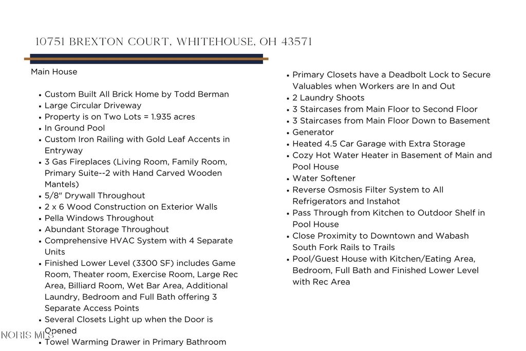 Step into a world of refined elegance and extraordinary comfort in this breathtaking custom Todd Berman estate, offering over 9,300 square feet of impeccably designed living space. Every detail invites you to relax, entertain, and truly feel at home. The main residence features 5-6 luxurious bedrooms, each with its own private en suite, creating serene retreats for family and guests alike. The thoughtfully designed lower level is an entertainer's dream"”complete with a spacious game room, private theater, exercise room, and endless possibilities for making lasting memories. A beautifully appointed 1,000+ square foot guest/pool house with a full kitchen and bath provides the perfect haven for extended stays, hosting, or multigenerational living. Outside, your personal oasis awaits. A sprawling patio surrounds the sparkling inground pool, offering a resort-style setting ideal for quiet mornings, lively gatherings, and unforgettable summer nights. Tucked away on a peaceful, wooded cul-de-sac in the highly sought-after Anthony Wayne School District, this property offers a rare sense of privacy and tranquility. With the option to purchase an additional half-acre for expansion, this exceptional home is more than a residence"”it's a lifestyle of comfort, beauty, and timeless luxury.