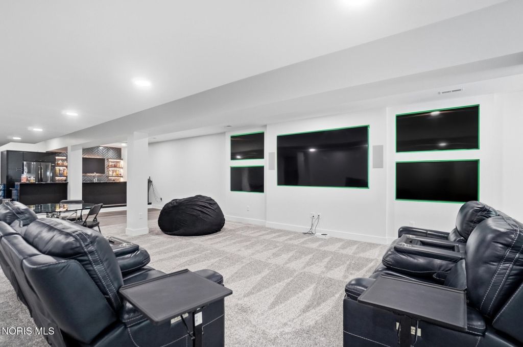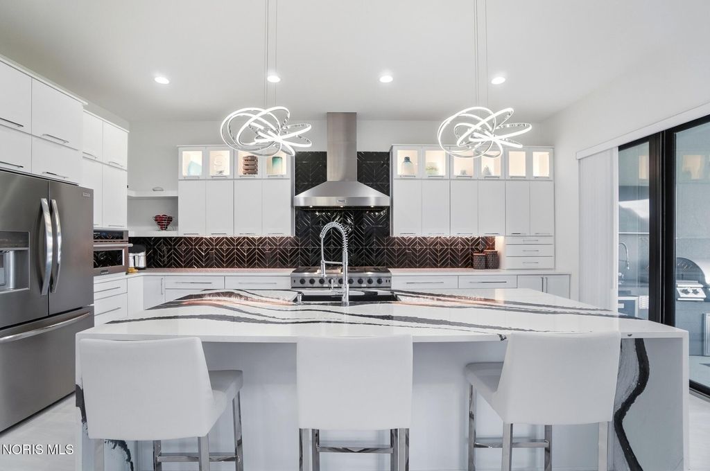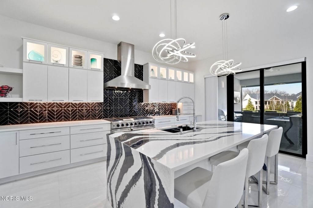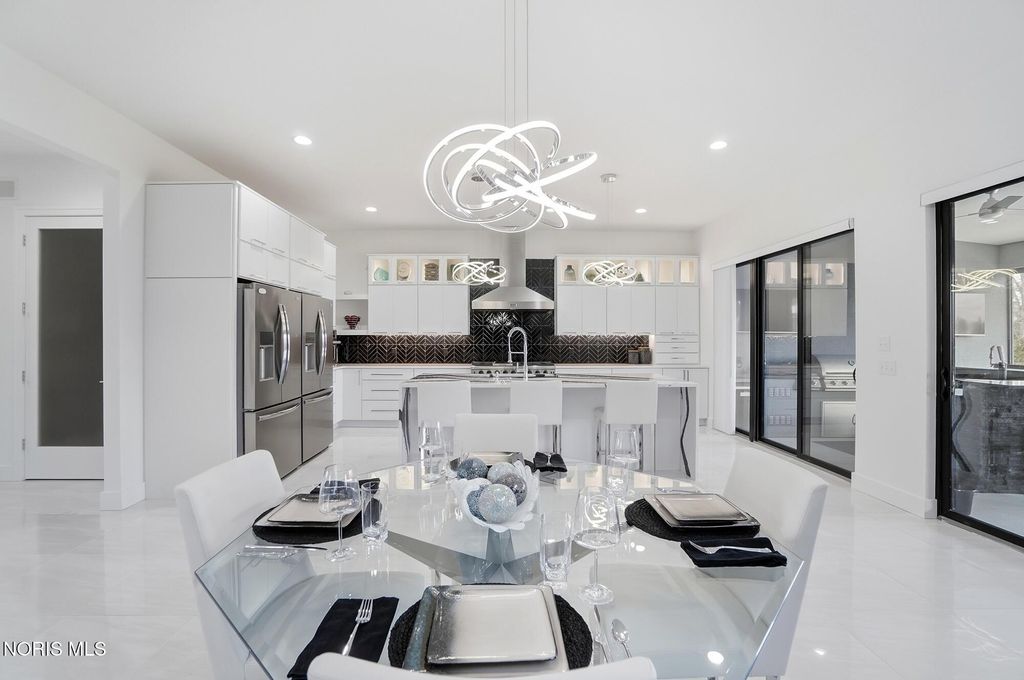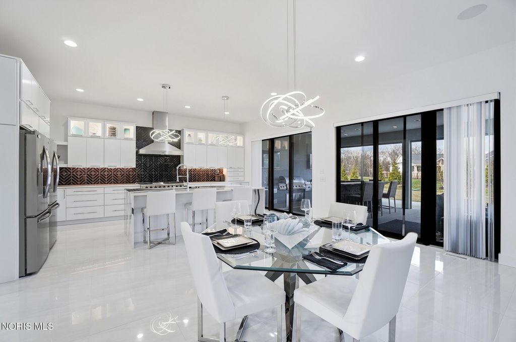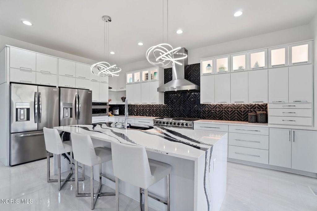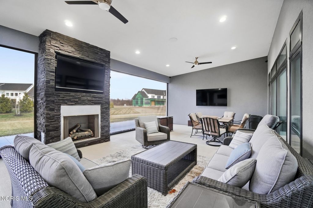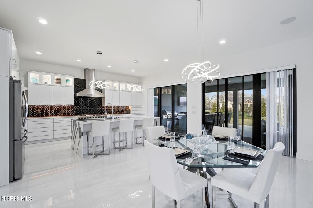 Perrysburg's Sanctuary In The Woods is the ideal setting for this one of a kind luxury home. Located on just under three quarters of an acre...close to top rated schools, entertainment and shopping. Designed with attention to every detail, this 5100 sq ft home features an additional 3600 sq ft of living space in the newly finished lower level! This open-concept layout, highlighted by modern finishes and gleaming porcelain floors, is perfect for entertaining and every day living! The chef's kitchen shines with a freestanding Thor gas range, huge island with waterfall quartz countertop and a seamless flow into the great room! 2 walk-in pantries! 2 story great room showcases a floor to ceiling porcelain tile gas burning fireplace! The first floor primary features a private patio and cozy sitting area with coffee bar and beverage fridge! His and her walk-in closets and a private bath with dual vanities, custom tile shower and jetted soaking tub complete this ensuite! A 2 story den and a formal dining room with wine bar and beverage fridge add to the functionality of this home! The newly finished lower level is phenomenal! The 3600 square feet includes a full kitchen, family room, exercise room, theatre room wired for video equipment, full bath and 5th bedroom with egress window! When you're finished in the lower level there is 1170 square feet of covered outdoor living space complete with fireplace, kitchen and powered privacy screens! The outdoor kitchen is fully functional and equipped with sink, grill, griddle, ice chest, beverage fridge and kegerator! 3 large bedrooms, all with private baths on the second floor! Andersen windows, solid core doors, custom wine rack and accent lighting! There is also a shaft in place for a future elevator! 4 car garage, one equipped with 10 foot doors! 1125 Hunting Creek is where contemporary design meets modern family living!