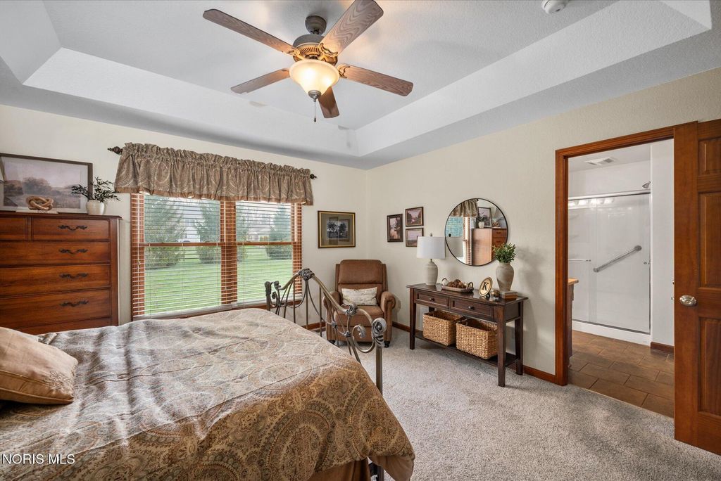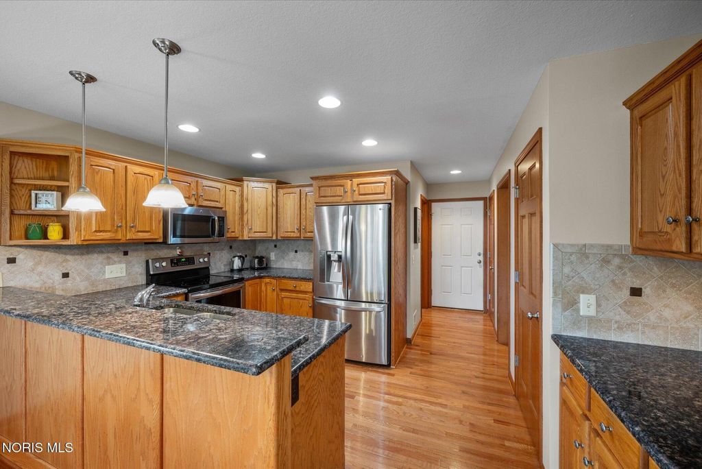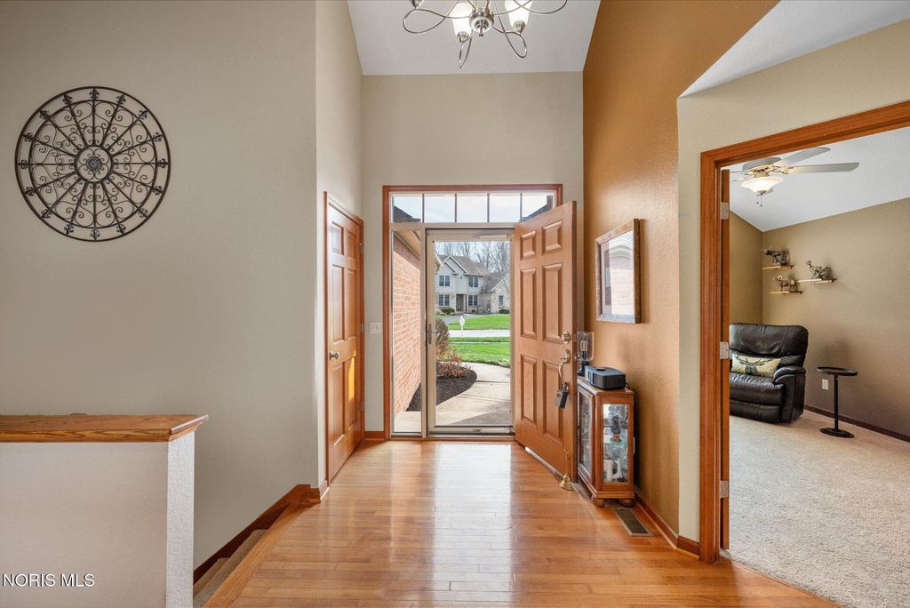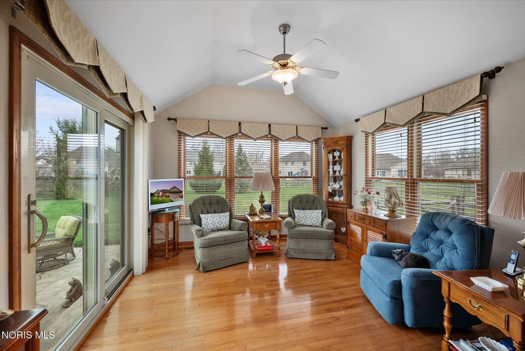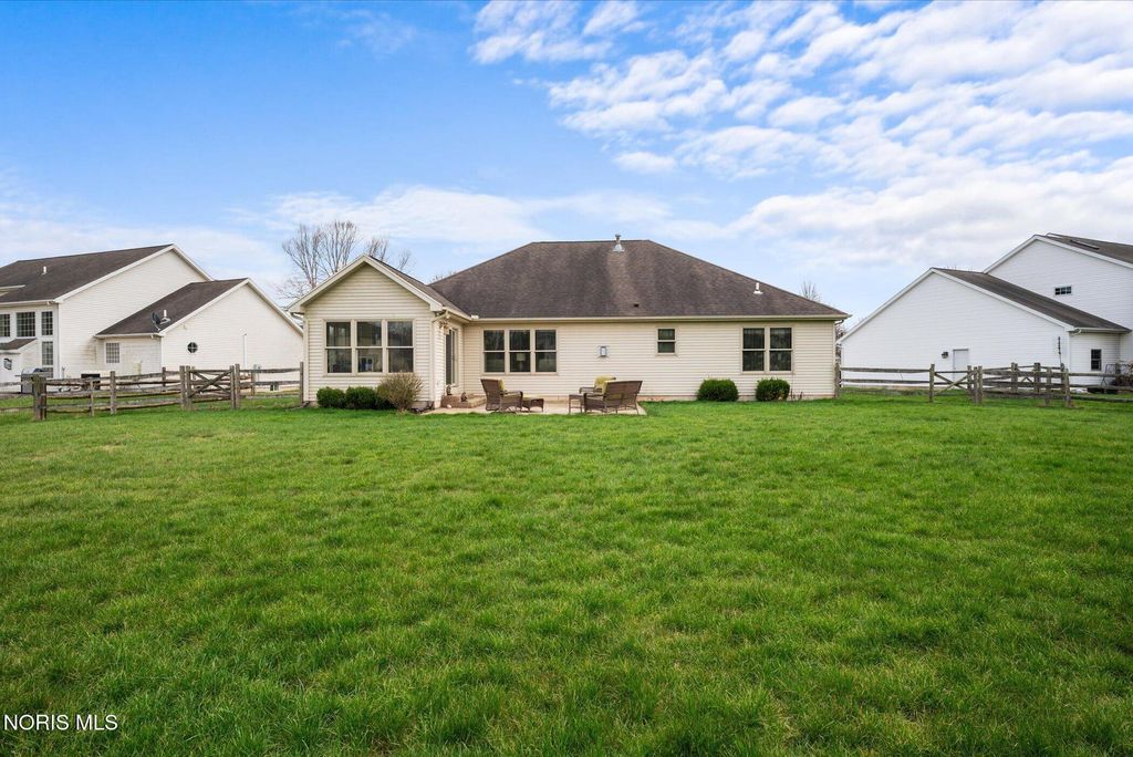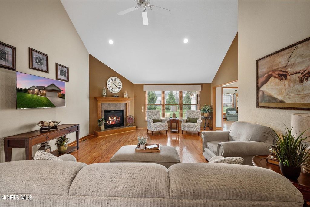 This ranch-style home in Monclova offers comfortable single-level living on a generous lot of just under one acre. The property features a fully fenced backyard and a large stamped concrete patio. Inside, the spacious great room boasts 15-foot ceilings, hardwood floors, and a gas fireplace. The kitchen is equipped with custom oak cabinets, granite countertops, stainless steel appliances, and a breakfast bar. A sunroom provides a bright space with ample natural light. The primary bedroom includes a double vanity, a soaking tub, and a separate shower. Additional features include an oversized two-car garage and a full basement, providing extensive storage options.