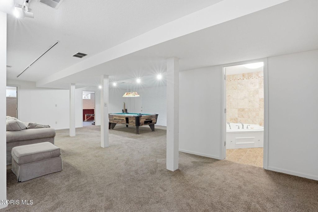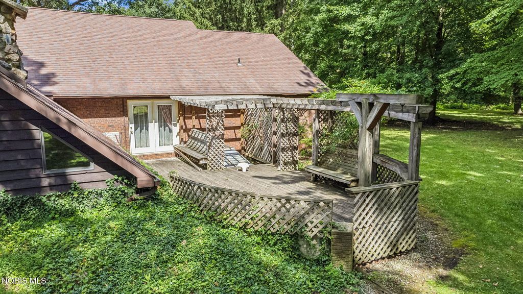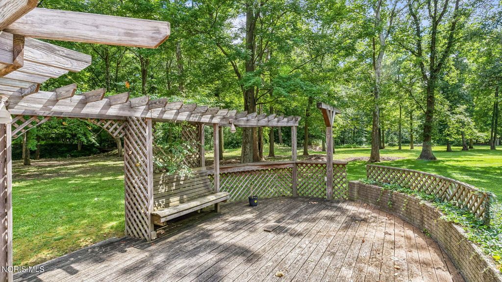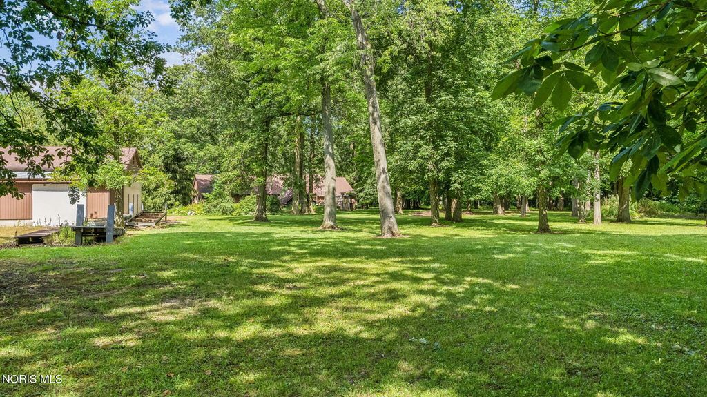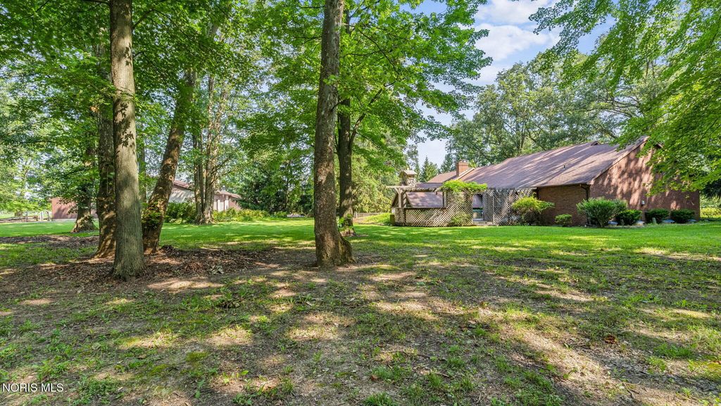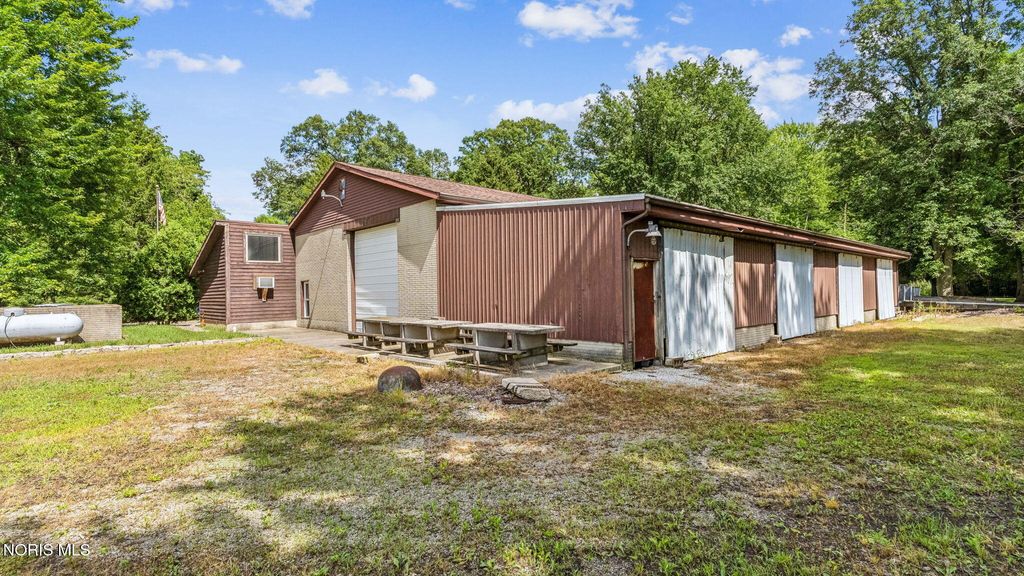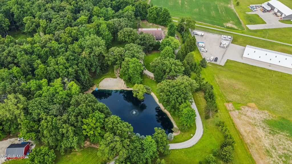 SECLUDED yet close to Findlay! This stunning country home sits in a PARK-LIKE setting and is accessed by a tree-lined driveway, offering a perfect balance of privacy and convenience. An abundance of Evergreens on the WOODED estate features a BRICK & CEDAR RANCH with 6 bedrooms, 3 full baths, a 3-CAR GARAGE, all on 6.34 ACRES. The MAIN FLOOR offers a functional layout with a spacious PRIMARY SUITE with bath and walk-in closet, plus two additional bedrooms (one currently used as an office), formal dining room, living room, kitchen with dinette, full bath, and MAIN FLOOR LAUNRY. Just a few steps down, you'll find the inviting family room featuring a STUNNING ROCK WALL and WOOD STOVE. Continue to the FINISHED BASEMENT with a game room, full bath with jetted tub, ample storage, and three additional bedrooms (one is currently an exercise room)"”all with a neutral palette ready for your personal touch. Endless possibilities with the OUTBUILDINGS"”ideal for trucking, landscaping, auto shop, mini farm, or kennels, etc. The impressive 80x40 (3,200 sq ft) poured concrete walled commercial building includes approximately 1,000 sq ft of office space with a bathroom, heated with electric baseboard and propane fireplace (with woodburner hookup), plus cooled with wall A/C. The shop features a second bath (not currently), THREE OVERHEAD DOORS (two 10 ft and one 14 ft), cement floor with commercial drainage system. An additional ~1,600 sq ft attached building offers flexibility for animal stalls, storage, or other uses. Enjoy summer days at the fully stocked 3/4 acre POND with sand beach, fountain, and waterfall. Outdoor living includes a covered front porch, rear deck, and concrete patio with propane gas line and water access. 2012 furnace with propane/wood heating options and 2026 central air. Drinking water is supplied from the pond with a filtration system. A rare opportunity offering space, versatility, and a peaceful country lifestyle just minutes from town.