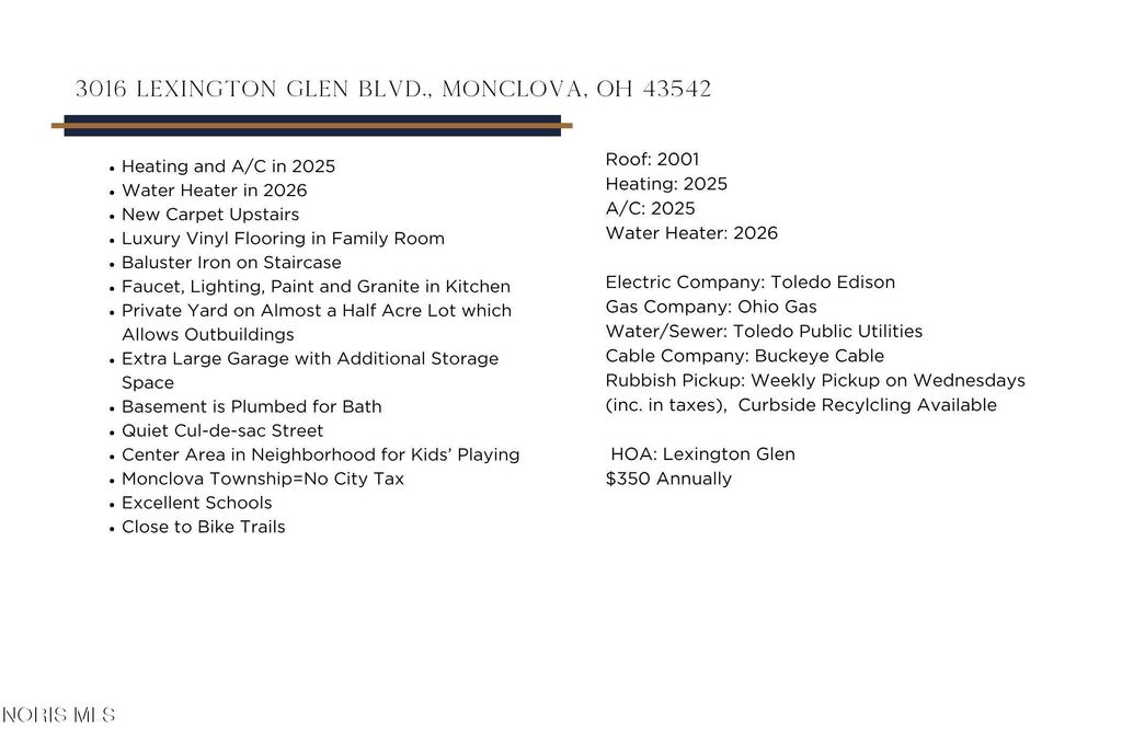 Step into a home where warmth, comfort, and connection come naturally. The heart of the home is a beautiful kitchen that flows effortlessly into the inviting family room"”creating the perfect space for gathering, entertaining, and making lasting memories. A stunning family room window fills the space with natural light and offers breathtaking sunset views, turning everyday moments into something truly special. Designed with family living in mind, this home provides generous closet space and thoughtful updates throughout, including new carpet upstairs and stylish luxury vinyl flooring in the family room. The elegant staircase with iron balusters adds a touch of sophistication, while the kitchen shines with updated granite countertops, modern lighting, fresh paint, and a sleek faucet"”blending beauty and functionality seamlessly. Major mechanical updates offer peace of mind, including a new heating and A/C system (2025) and water heater (2026). The spacious basement is already plumbed for a future bathroom, giving you room to grow and customize. Outside, you'll fall in love with the private yard"”nearly half an acre"”offering endless possibilities, including space for outbuildings. The extra-large garage provides ample room for vehicles, hobbies, and additional storage. Nestled on a quiet cul-de-sac street, this home is part of a welcoming neighborhood with a central area where kids can play and friendships can flourish. Located in desirable Monclova Township"”enjoy the benefit of no city taxes"”along with excellent schools and easy access to nearby bike trails. This isn't just a house"”it's a place to grow, to gather, and to truly feel at home.