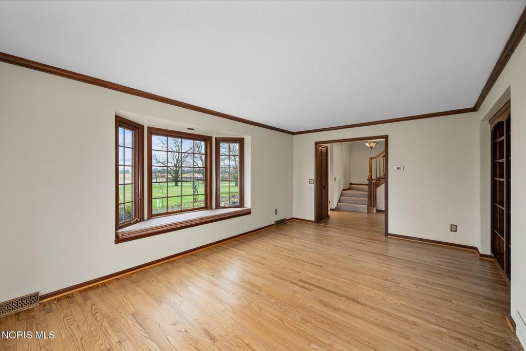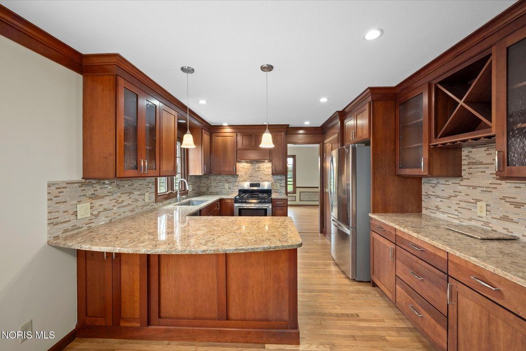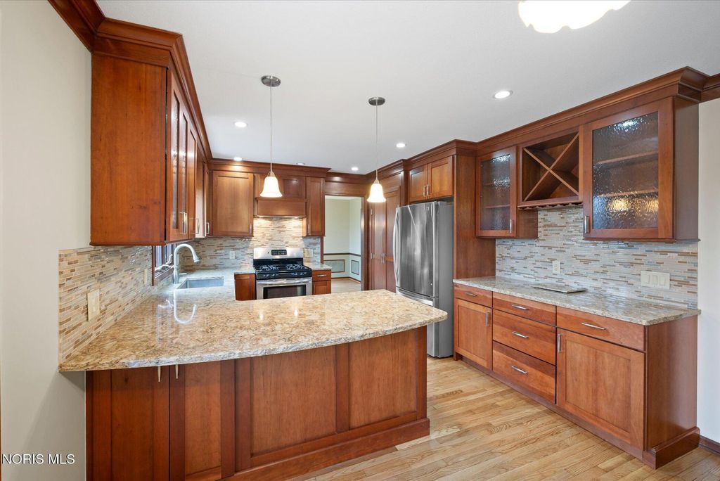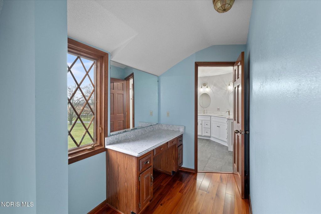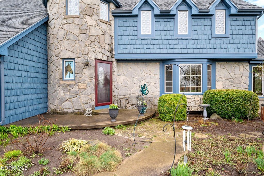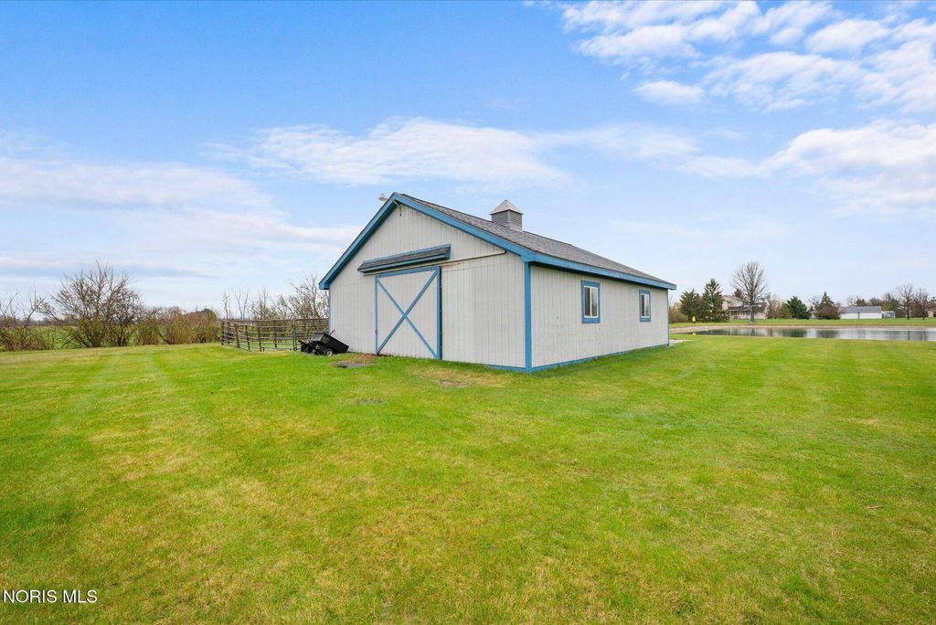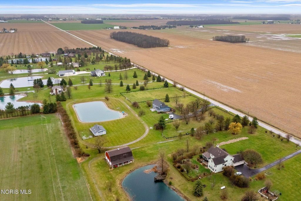 Just four miles west of Centennial Road sits this picturesque equestrian property styled in the English Manor tradition. The five acre parcel boasts 425 feet of front footage providing both privacy and elbow room to enjoy this pastoral paradise. A tree-lined driveway warmly welcomes you to this custom built home which is flanked on either side by one acre pastures perfect for grazing your horses or alpacas. A half acre pond sits to the rear of the home and a 3 stall barn with adjacent paddock is located in the northeast corner of the property. The home has been carefully and deliberately enhanced through the years with quality upgrades both inside and outside. The kitchen was replaced in 2014 with beautiful cherry cabinetry, quartz countertops, glass tile backsplash and new appliances. The primary bedroom is stunning with a 16 foot vaulted ceiling, gleaming Brazilian walnut floors and windows overlooking three sides of the property. The primary en suite was remodeled in 2024. The sunroom addition with vaulted ceiling, tile floor and newer Pella windows provides a panoramic view of the entire south side of the property. Enhancements to the exterior include new siding in 2018 and a composite deck in 2012. Offerings of this nature are few and far between in Lucas County. Enjoy this heavenly setting just minutes from downtown Sylvania.