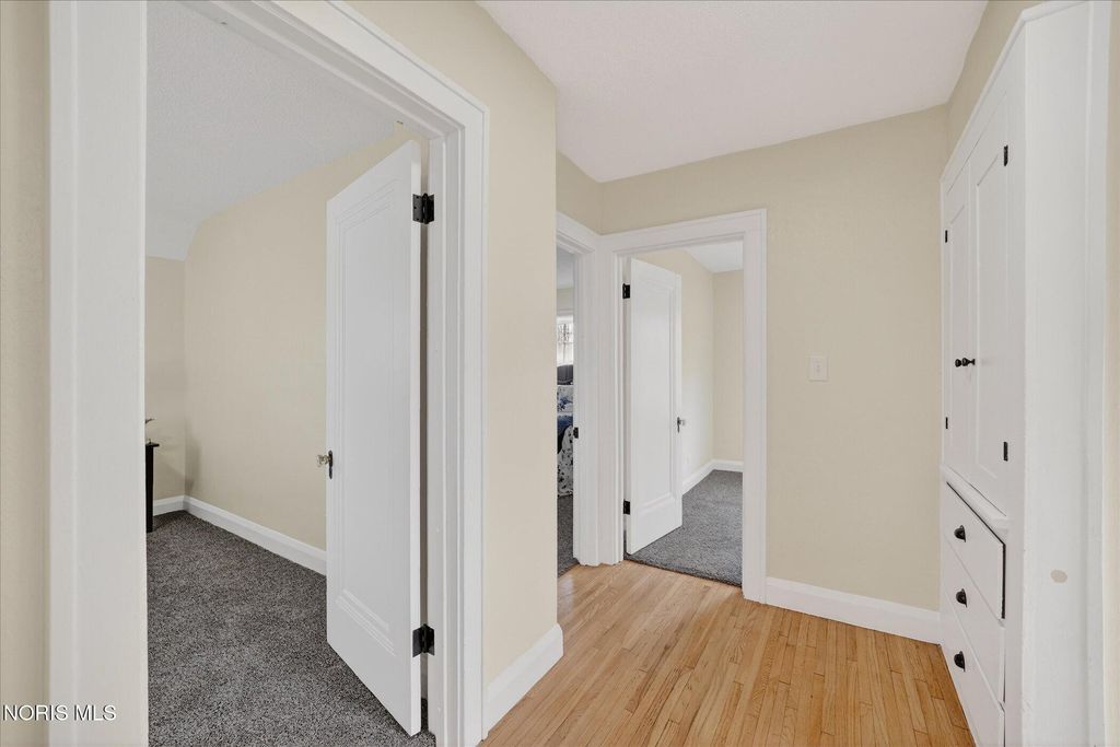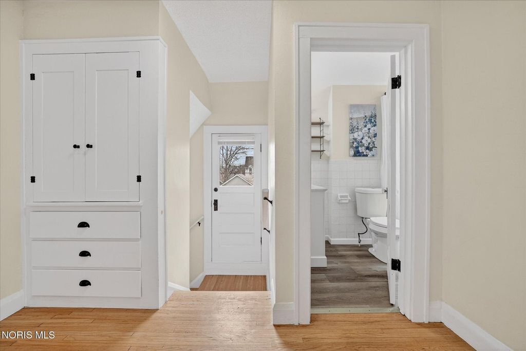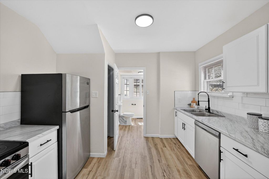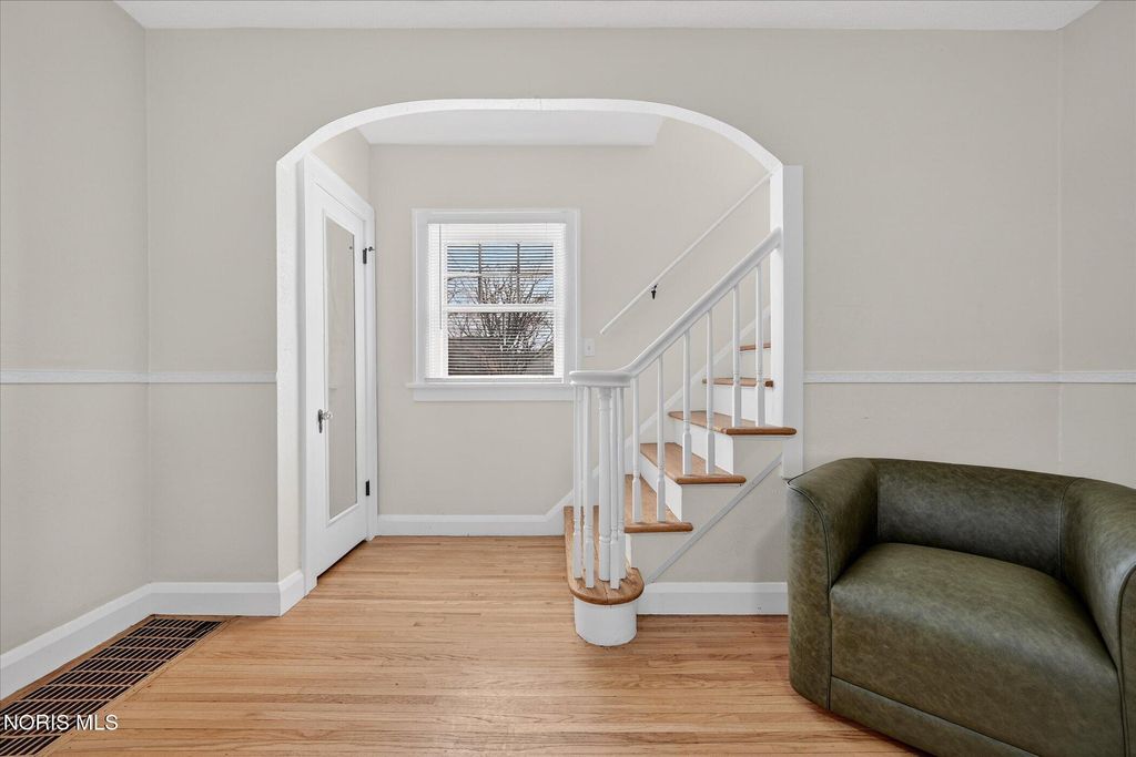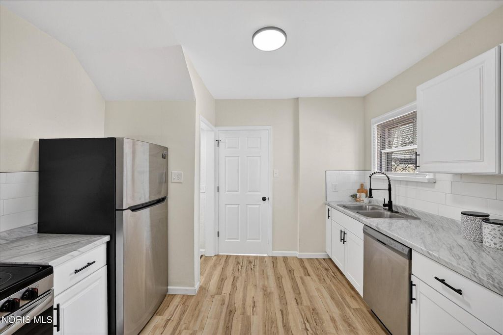 Charming 3-bedroom, 2-bath home in West Toledo with character you can feel the minute you walk in. Start on the screened-in front porch, then step into a formal living room and dining room with beautifully refinished hardwood floors, built-ins, and great natural light. The kitchen has been updated with LVP flooring, newer countertops, a subway tile backsplash, stainless steel appliances, and modern fixtures. Upstairs features newer carpeting and spacious bedrooms with large closets. Roof is a year old. You'll also love the full unfinished basement with washer/dryer hookups for extra storage and function. Central AC and heat keep things comfortable year-round. Outside, enjoy a privacy-fenced backyard plus a detached 2-car garage. So much to love, keys at closing!