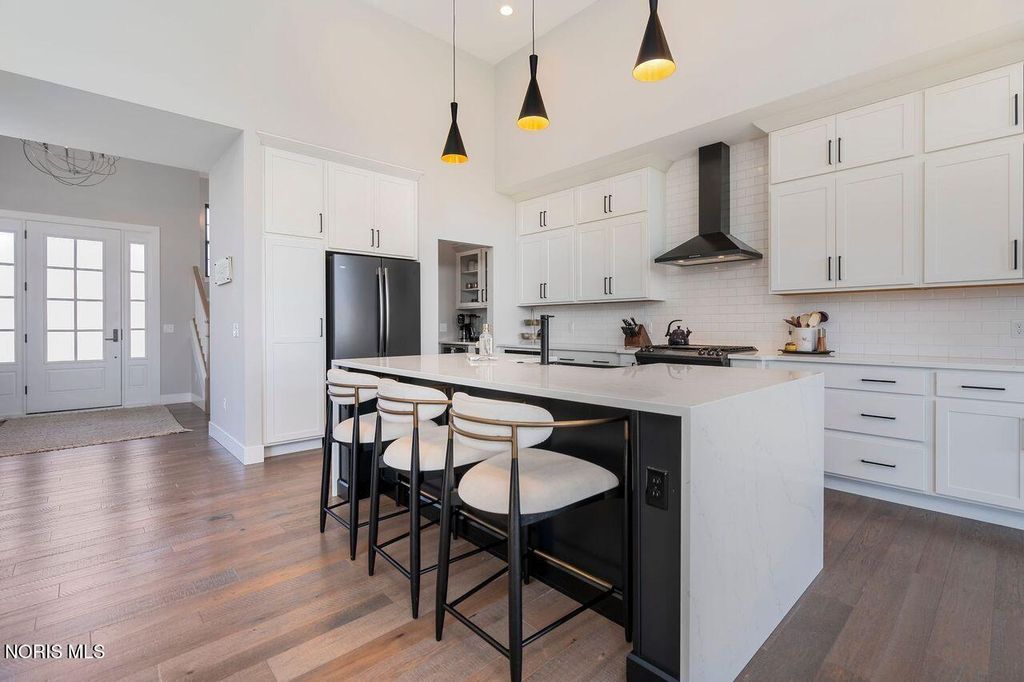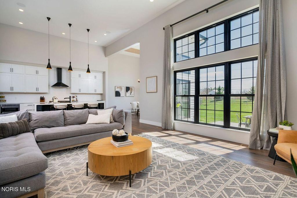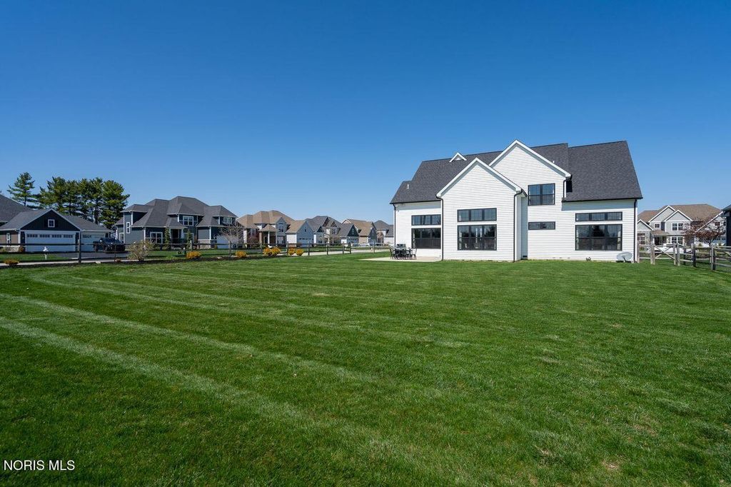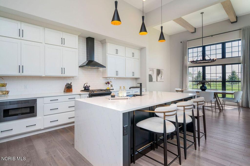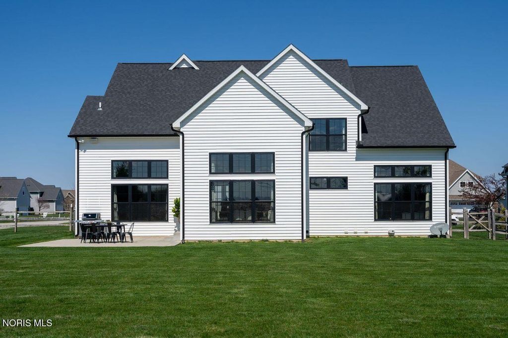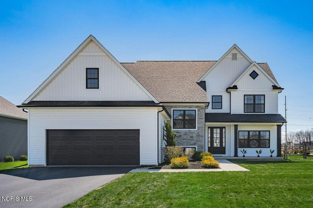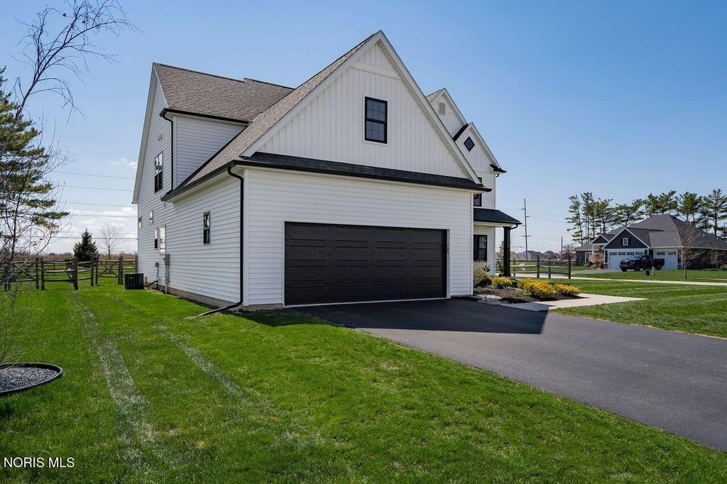 Stunning, gently lived-in residence offering the feel of newer construction"”without the premium price tag. Built less than six years ago, this thoughtfully designed home features a highly sought-after primary bedroom on the main level, creating a rare and desirable floor plan. Beautiful light-toned wood flooring flows throughout most of the main living space, leading into a show-stopping kitchen complete with an oversized quartz island with waterfall edge, upgraded appliances, and stylish lighting. Vaulted ceilings in the family room, kitchen, and dining area flood the home with natural light through large, upgraded black-trimmed windows, creating an open and airy atmosphere. Elegant wood beams accent the dining space, adding warmth and character to every meal. Upstairs, generously sized guest bedrooms are complemented by a spacious full bathroom featuring a dual vanity. The finished lower level provides over 1,000 square feet of additional living space along with a full bathroom, while approximately 900 square feet of unfinished basement offers ample storage or future expansion potential. Drop zone by garage entrance is outfitted with lockers. Custom details throughout"”such as wood beams, tall baseboards, designer interior doors, black windows, and a large walk-in closet in the primary suite"”set this home apart. Step outside to a fully fenced yard offering both privacy and peace of mind, complete with a beautiful concrete patio and meticulously maintained landscaping"”perfect for relaxing or entertaining. Welcome to the best of Perrysburg living!
