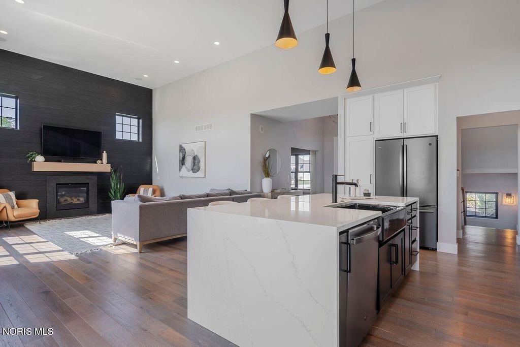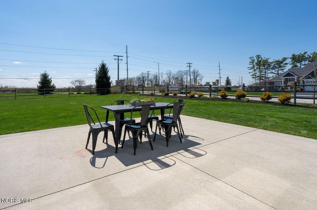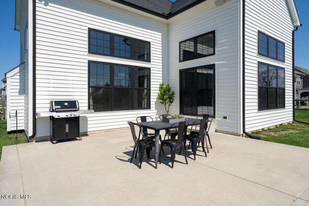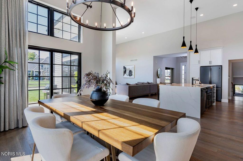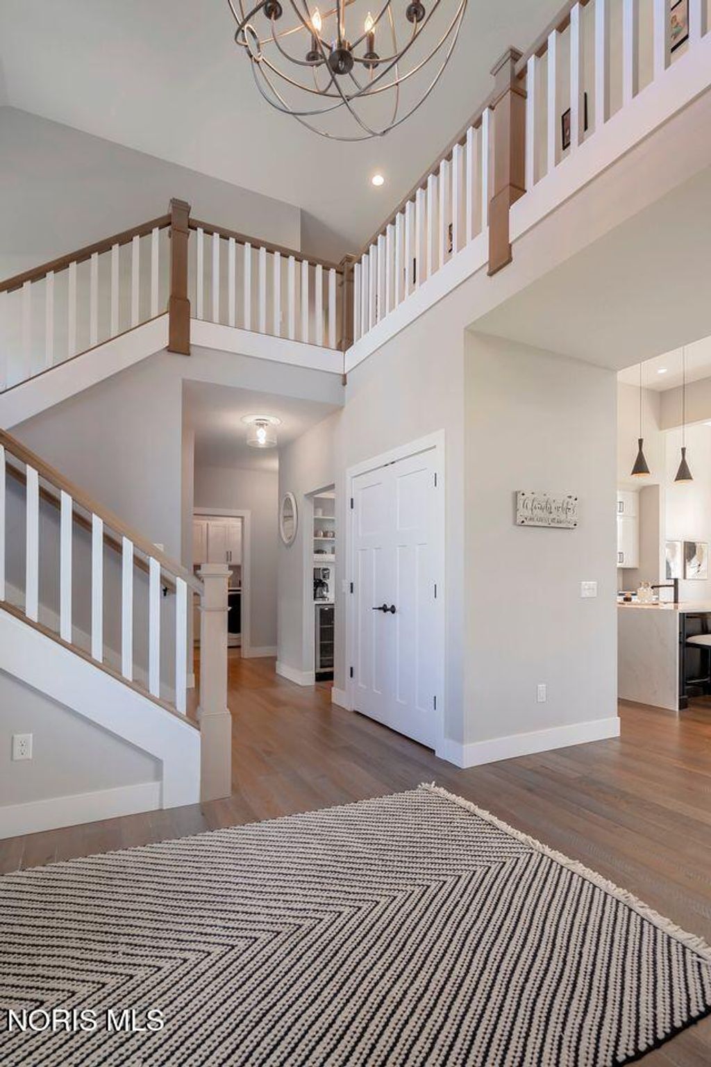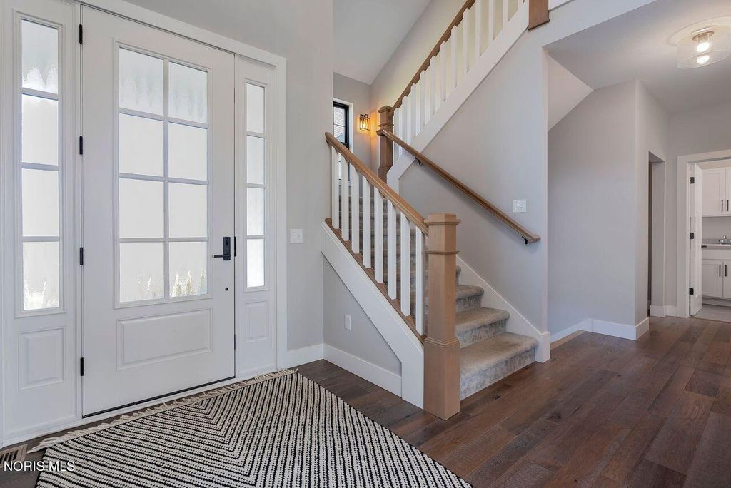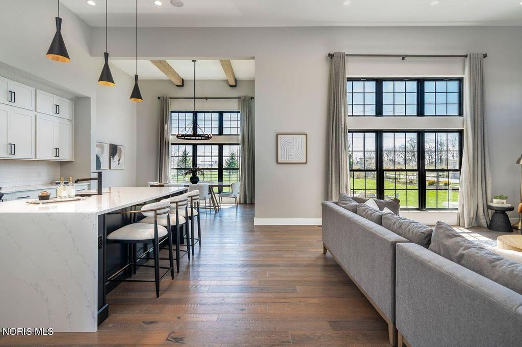 Stunning, gently lived-in residence offering the feel of newer construction"”without the premium price tag. Built less than six years ago, this thoughtfully designed home features a highly sought-after primary bedroom on the main level, creating a rare and desirable floor plan. Beautiful light-toned wood flooring flows throughout most of the main living space, leading into a show-stopping kitchen complete with an oversized quartz island with waterfall edge, upgraded appliances, and stylish lighting. Vaulted ceilings in the family room, kitchen, and dining area flood the home with natural light through large, upgraded black-trimmed windows, creating an open and airy atmosphere. Elegant wood beams accent the dining space, adding warmth and character to every meal. Upstairs, generously sized guest bedrooms are complemented by a spacious full bathroom featuring a dual vanity. The finished lower level provides over 1,000 square feet of additional living space along with a full bathroom, while approximately 900 square feet of unfinished basement offers ample storage or future expansion potential. Drop zone by garage entrance is outfitted with lockers. Custom details throughout"”such as wood beams, tall baseboards, designer interior doors, black windows, and a large walk-in closet in the primary suite"”set this home apart. Step outside to a fully fenced yard offering both privacy and peace of mind, complete with a beautiful concrete patio and meticulously maintained landscaping"”perfect for relaxing or entertaining. Welcome to the best of Perrysburg living!