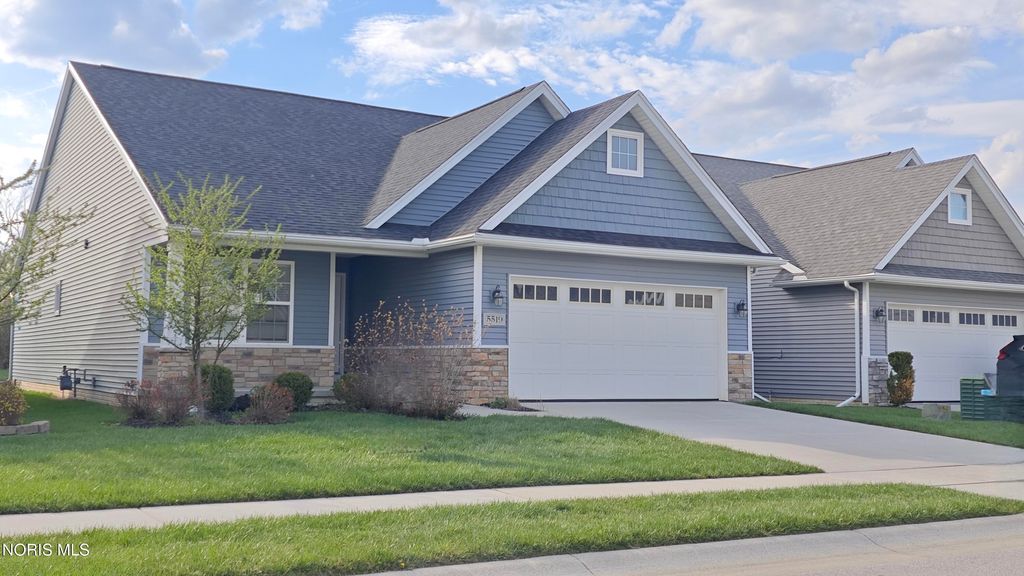Elevated West Sylvania living defined by natural light, architectural detail inspired by sand and sky through a grand open concept design amplified by real wood and stone finishes.. Expansive windows draw in warm sunset light across extra wide luxury wood floors, while a stone fireplace creates a striking focal point at the heart of the home. The oversized quartz island anchors a true gathering space, designed for both everyday living and effortless entertaining. At night, a motorized curtain descends to transform the windows into a theater perfect for movie nights or game days. The primary suite offers a quiet retreat through light-enhancing tray ceilings, custom walk-in closet, and a tiled shower and dual vanities. Outdoors, a clean-lined patio and open backyard extend the living space with minimal upkeep. 2 car garage features pull down stairs for extra storage