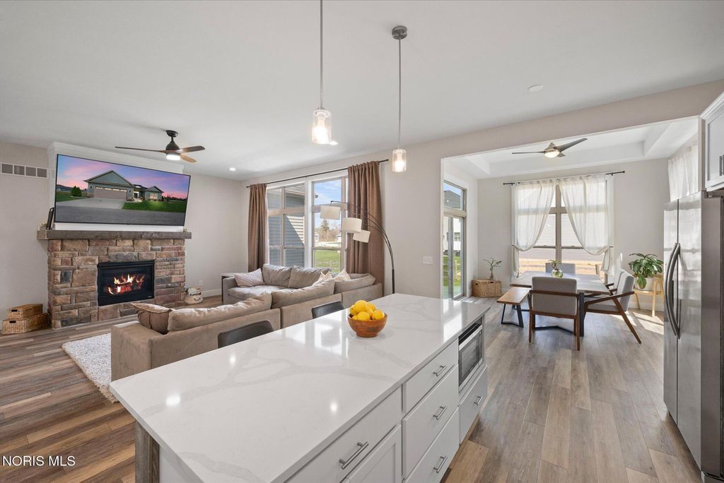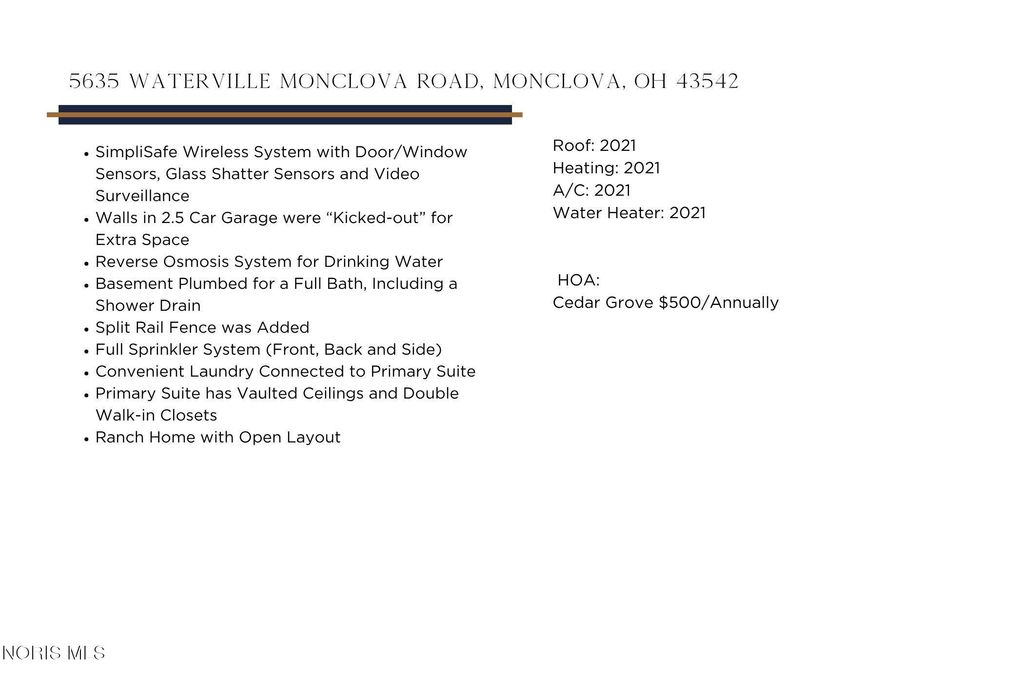 Welcome home to this beautifully crafted newer ranch in Monclova, where comfort, convenience, and thoughtful upgrades come together in perfect harmony. From the moment you step inside, you'll feel the warmth of the open layout"”designed for effortless living and memorable gatherings. The heart of the home flows seamlessly, while the serene primary suite offers a true retreat with soaring vaulted ceilings, an abundance of space, and not one"”but two"”generous walk-in closets. Enjoy the everyday luxury of a connected laundry space, making life just a little easier. Downstairs, the possibilities are endless with a basement already plumbed for a full bath, including a shower drain"”ready for your personal vision. The expanded 2.5-car garage provides that extra room you didn't know you needed, perfect for storage, hobbies, or simply breathing space. Step outside and fall in love with the peaceful setting"”complete with a charming split rail fence and a full sprinkler system that keeps the lawn lush and inviting all season long. This home also offers modern peace of mind with a SimpliSafe wireless security system featuring door and window sensors, glass shatter detection, and video surveillance. Plus, enjoy the added comfort of a reverse osmosis system delivering clean, refreshing drinking water. Every detail has been carefully considered to create a home that feels as good as it looks"”inviting, functional, and truly special.