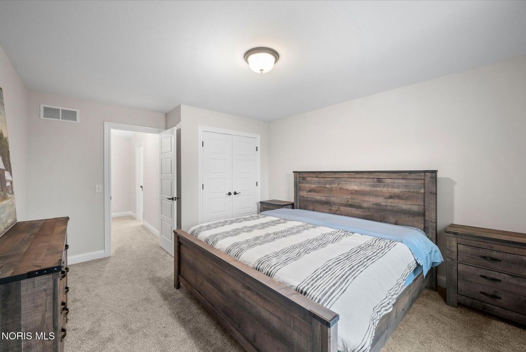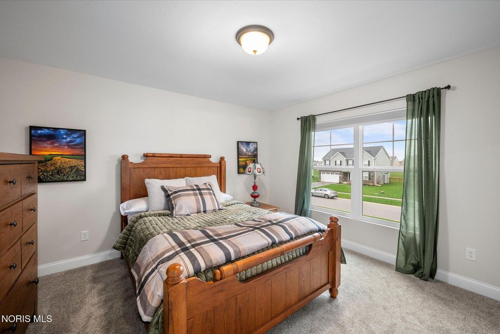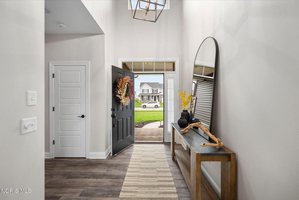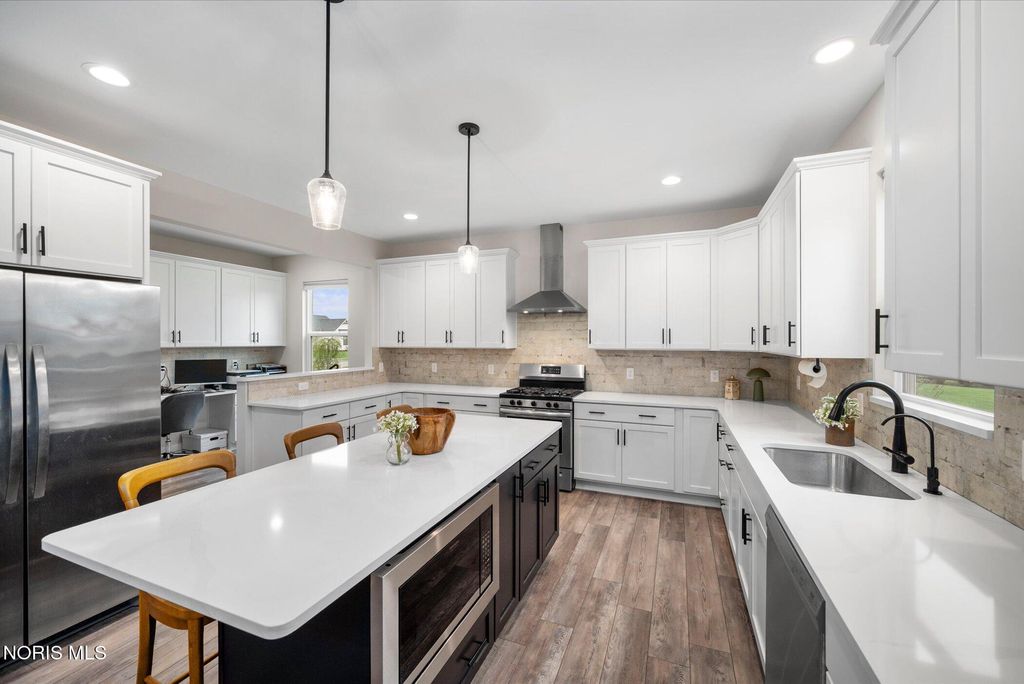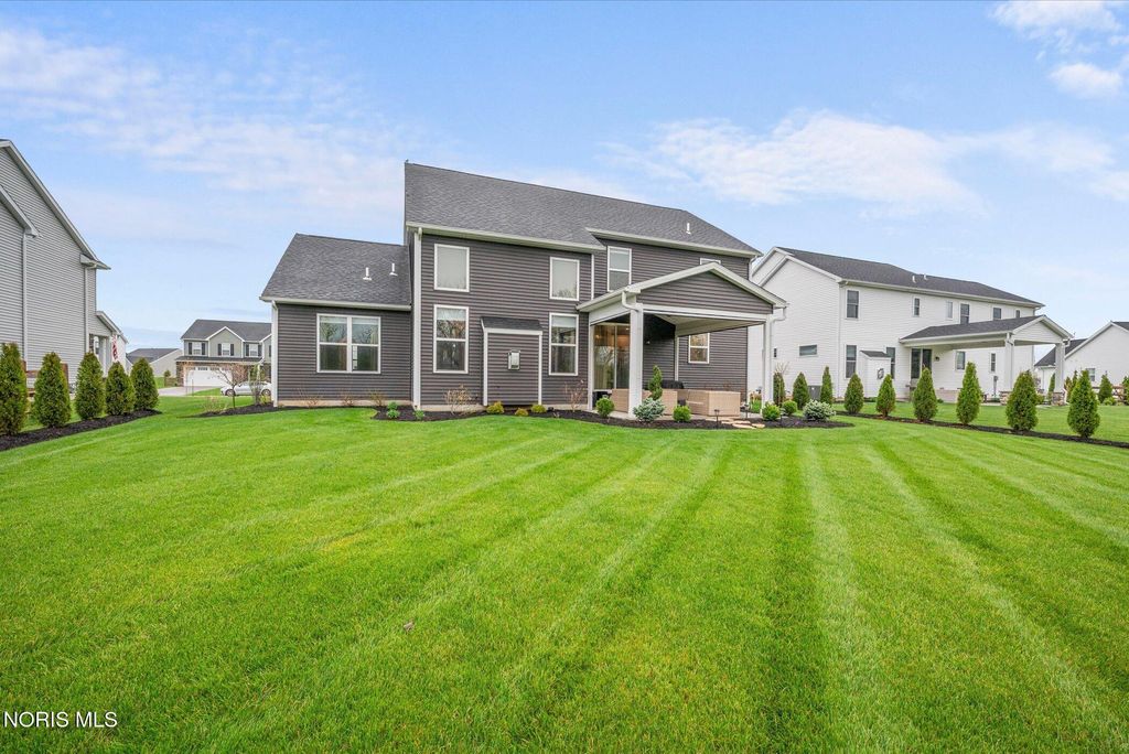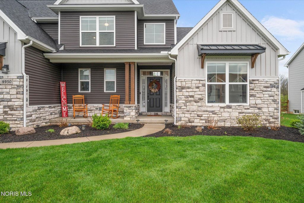 Stunning custom home in Blystone Valley Subdivision, built in 2023 and enhanced with numerous upgrades after construction. This beautiful home offers an open-concept layout with a dramatic two-story great room featuring a floor-to-ceiling gas fireplace and a wall of windows overlooking the private backyard. The gourmet kitchen is designed to impress with a large island, pantry, quartz countertops, gas range, stainless steel appliance package, tile backsplash, built-in desk area, and an adjoining dining space. A patio door leads to the covered patio, complete with remote-operated screens for added comfort and convenience. First-floor primary suite is a true retreat, offering a spa-like en suite bath with a walk-in tiled shower, soaking tub, dual sinks, and a spacious walk-in closet. The main level also includes a half bath and first-floor laundry with custom built-ins. Upstairs, you will find four spacious bedrooms with generous closet space and two full baths. The basement is ready to be finished, offering additional potential living space. Additional features include a two-car attached garage, a 12-zone Rain Bird irrigation system, and an owned EcoWater filtration system. Make this exceptional property your dream home.