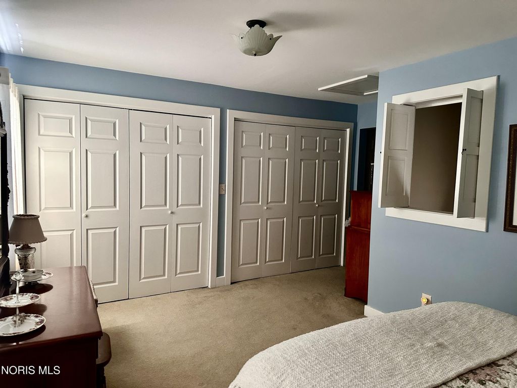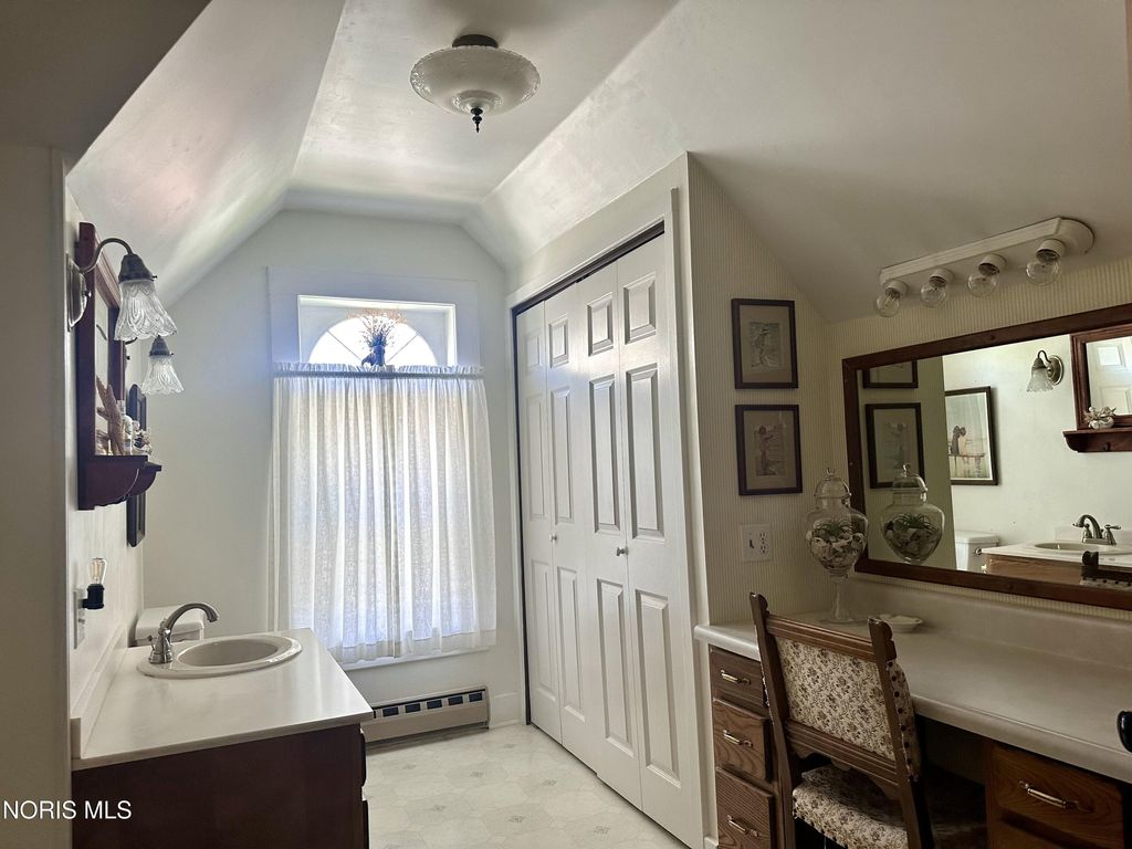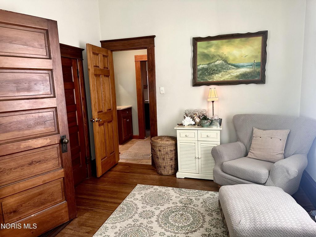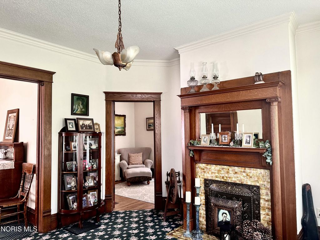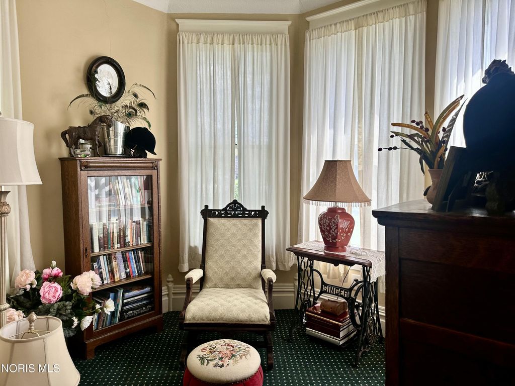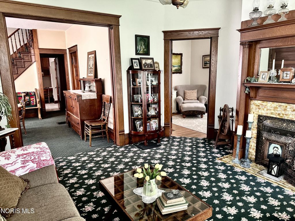 This exquisite Victorian-style home embodies timeless elegance and charm, featuring a graceful, curved staircase. The prominent turret adds a touch of grandeur, with pocket doors throughout the house. The elegant woodwork is a testament to the craftsmanship of a bygone era. A non-working vintage fireplace in the family room adds character to the room. A gas fireplace in the living room adds to the cozy ambiance. French doors lead to a sunlit sunroom with ceramic tile flooring. The high ceilings throughout the house enhance its spaciousness, and the breakfast room is both practical and inviting with a pantry, ample cupboards, and a desk area. The beautifully designed kitchen includes an island, tall ceilings, and cupboards with under-lighting. The top cupboards boast obscured glass and lighting, adding a touch of modern sophistication. The home offers four bedrooms"”three upstairs and one downstairs. Victorian-style carpet graces the dining room, family room, turret room, and staircase, adding to the home's cohesive aesthetic. The upstairs primary room features large, wall-to-wall closets, and the full bath includes a vanity for added convenience. A long-paved drive leads you the impressive garage that is equipped with heat, water, can lighting and three overhead doors, includes a drive-through feature and stairs leading to a finished open room, offering endless possibilities. This home is a true masterpiece of Victorian architecture and design. Stamped patio surrounded by a white picket fence.