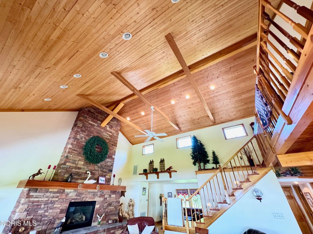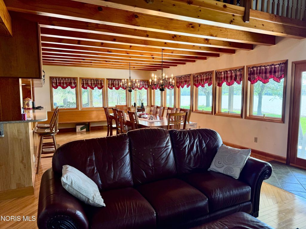 Welcome to your own deep water, riverfront lodge! This meticulously maintained home is jaw dropping at every turn with its architecture, views and care. Walk into the 2 1/2 story family room with tongue and groove ceiling, wood beams and stunning stone gas fireplace that opens to a wrap around porch with fantastic river views. Then enter into the galley kitchen with breakfast bar, new fridge, stove, microwave and Jenn-air double oven and cooktop along with the dining room having an exposed beam ceiling, dual chandeliers and seating for large gatherings...also with amazing views! The two beds down feature tongue and groove walls. A beautiful stairway takes you to the balcony leading into the primary suite where the cathedral wood ceiling and views are just as amazing! Also featuring a generous walk-in and bath. Outside, enjoy river life and the gardens while the 2 sheds have ample storage for boating equipment. Furniture, dock and other items are negotiable, please inquire.