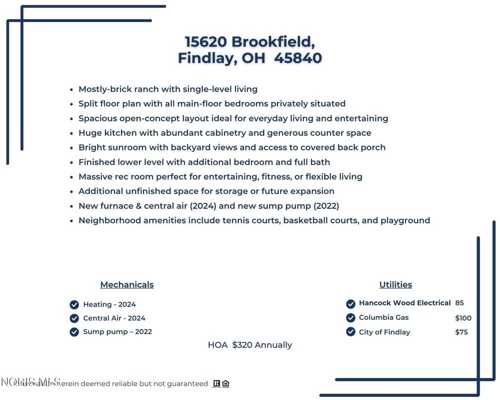 WELCOME HOME! This beautifully designed mostly-brick ranch offers the ease of single-level living with a highly desirable split floor plan - all main floor bedrooms are thoughtfully situated on one side of the home, creating private peaceful retreats away from the main living areas. At the heart of the home, you'll find a spacious, open-concept layout perfect for both everyday living and entertaining alike. The huge kitchen features abundant cabinetry, generous counter space, and flows seamlessly into a bright and inviting sunroom - ideal for informal dining and relaxing with views of the back yard and easy access to the covered back porch. The open design continues into them main living area, creating an airy, connected feel throughout. The finished lower level expands your living space even further, complete with an additional bedroom and full bath - perfect for guests or extended living - as well as a massive rec room ready for movie nights, game days or a home gym - or all three! With additional unfinished spaces, you can either use for storage or finish for even more space! Combining comfort, functionality and flexible living spaces, this home offers everything you need in a layout that truly works for today's lifestyle! NEW FURNACE AND CENTRAL AIR (2024); NEW SUMP PUMP (2022). Don't miss the neighborhood tennis and basketball courts and playground.