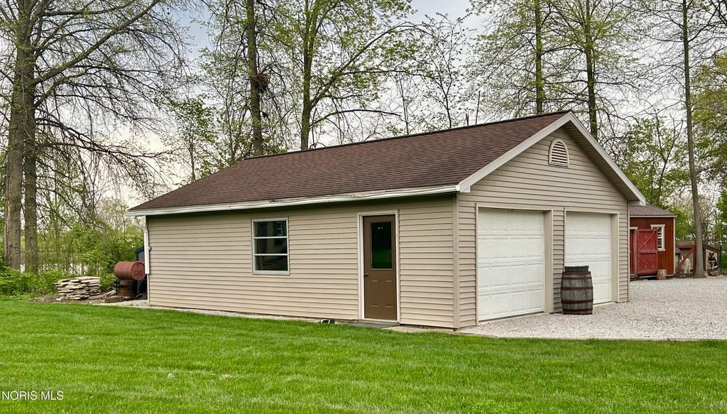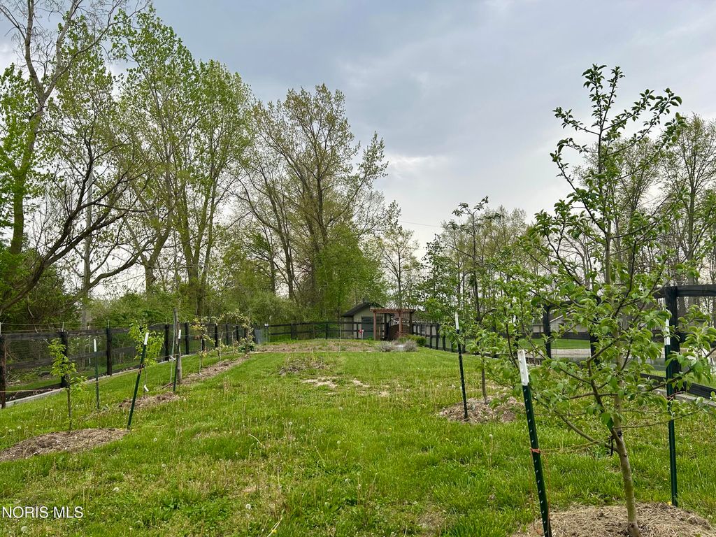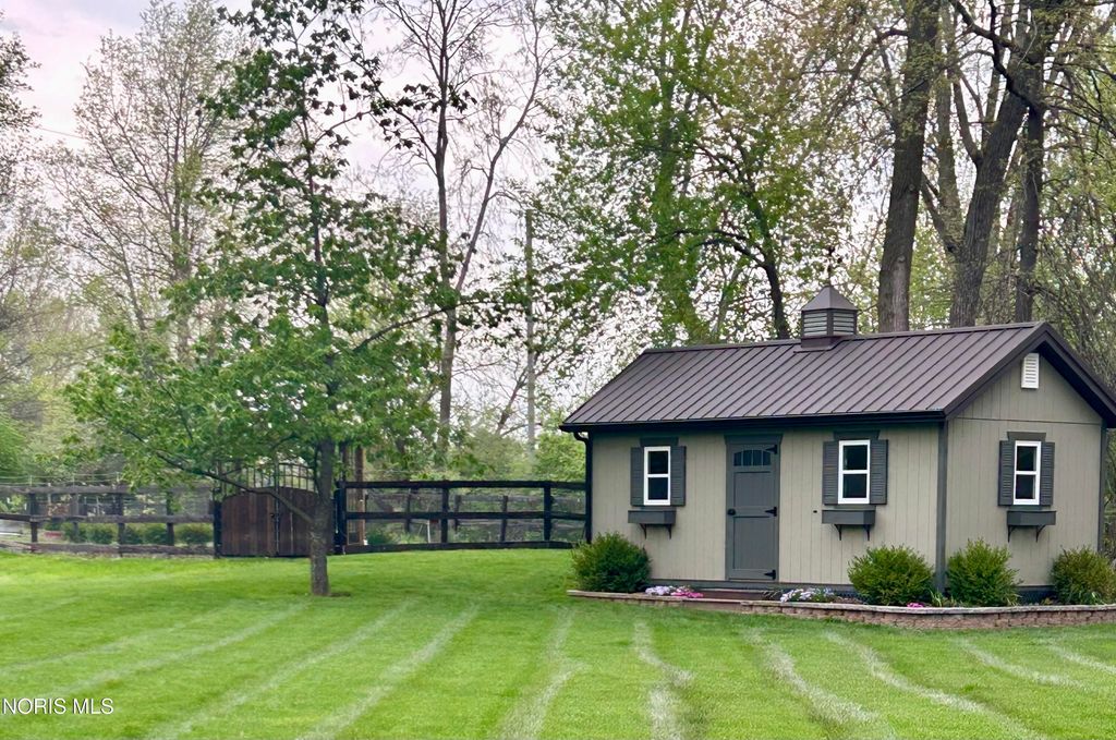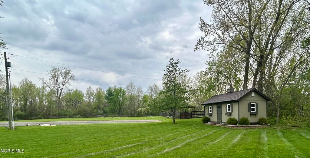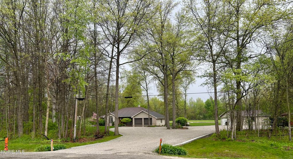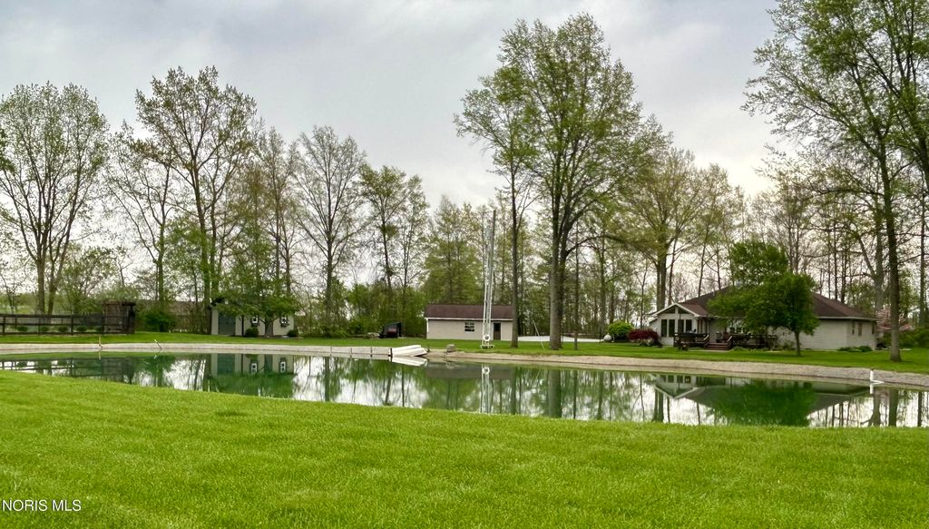 Beautiful home with pond views in a wooded setting and Maumee River access! Nestled in a peaceful, wooded setting, this inviting ranch home offers a rare combination of features you won't find just anywhere. A long, sweeping drive leads you to a beautifully maintained & landscaped home surrounded by dense hardwood and fruit trees, a 1/3-acre pond, an amazing garden with its own custom shed, an additional outbuilding & included river front access totaling 12 acres of seclusion & escape. Built in 1993, this 1997 sq foot home features an inviting foyer with hardwood floors and custom wainscoting that leads to a quaint living room with specially crafted built ins, a bay window that captures the back yard view, and a large wood burning fireplace. The eat-in kitchen highlights a vast assortment of hickory Harlan cabinetry, custom bar-island with granite countertop, back splash and stainless-steel appliances which opens to the four-season sunroom perfect for reading or relaxation. As you make your way towards the bedrooms, your eye catches the custom woodwork, trim and details that make this home exquisite. Starting with the vaulted-ceiling master suite, the bath and walk-in closet have been recently remodeled with updated granite, tile shower and ceramic tile flooring. The two remaining bedrooms have been updated as well with new doors, trim and flooring in addition to custom closet organization. Pella casement windows allow for much natural light and other upgrades include a new roof in 2013, new central air unit and furnace in 2017, new 40-gal water heater in 2025. The welcoming outdoor space offers a comfortable deck and patio area overlooking the backyard and pond; the fenced in garden is politely protected against the wildlife that venture in to help themselves to the fruit trees & vegetables and a custom 12x24 garden shed that awaits your tools, pots & creativity. The 24x30 pole barn has loft storage, concrete & insulation offering an option for storage, hobbies or the perfectly outfitted mancave. Bring your kayaks, coolers & fishing poles ... the Maumee River awaits and summertime is just around the corner! Call us for a tour - and feel all that this property has to offer.