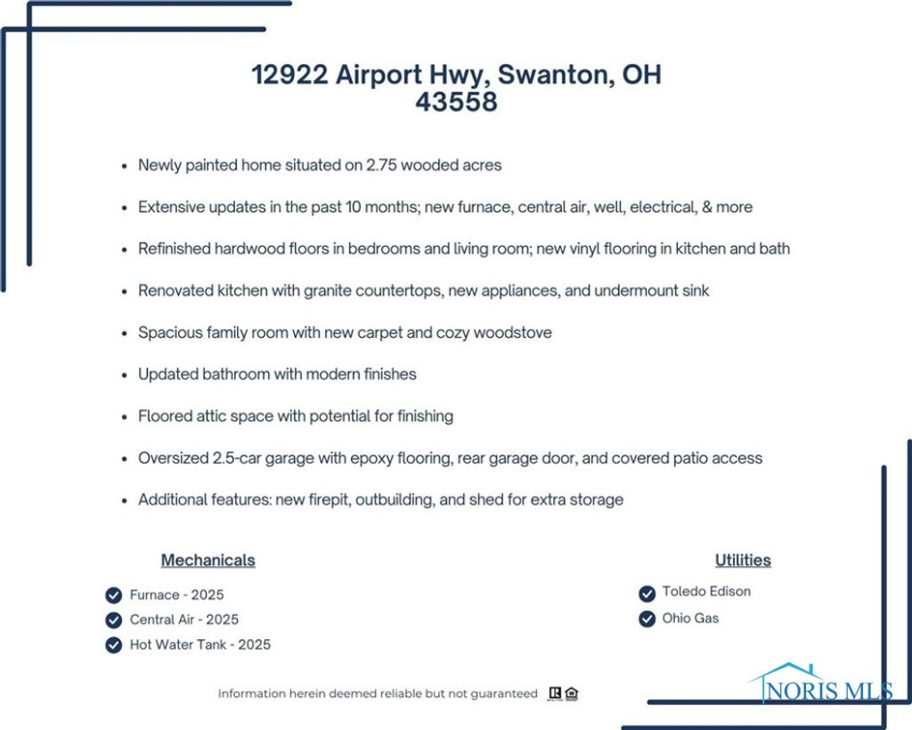 Nestled on 2.75 wooded acres. EXTENSIVE UPDATES in last 10 months include: FURNACE, CENTRAL AIR, WELL, ELECTRICAL, BATH, INTERIOR/EXTERIOR PAINT AND MORE! Refinished hardwood floors in both bedrooms and living room. New LVP flooring and granite tops in kitchen and bath. Large family room boasts new carpet and a woodstove. Updated kitchen w/ new appliances and undermount sink. Floored attic could easily be finished. Large 2.5 car garage w/ epoxy flooring and back garage door leading to covered patio! NEW FIREPIT. Outbuilding and shed for additional storage. Nothing to do here but MOVE IN!
