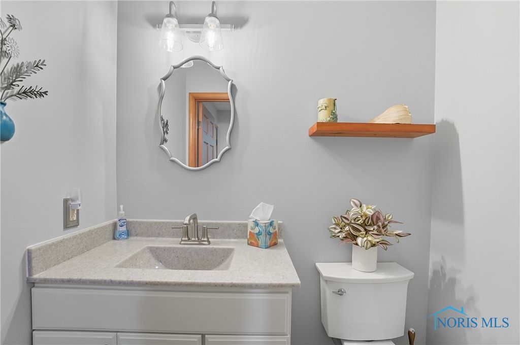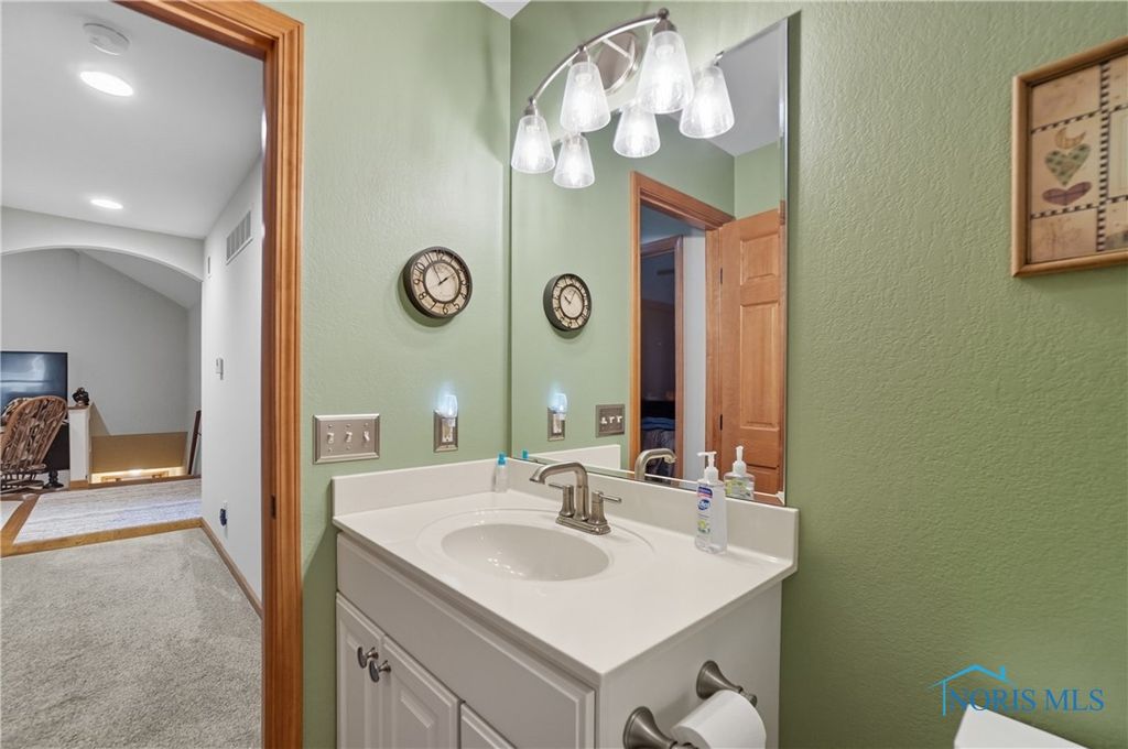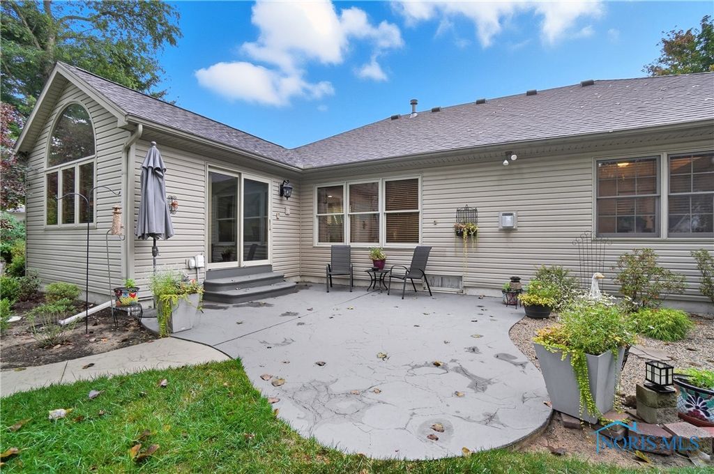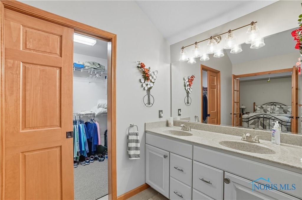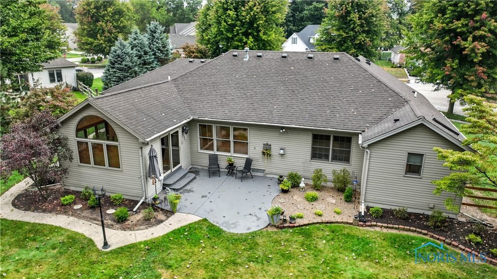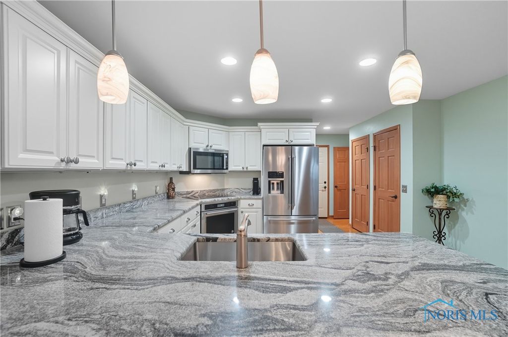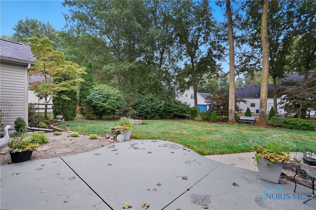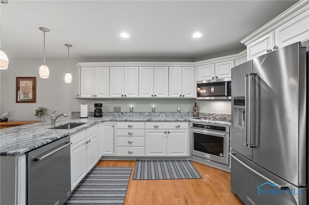 Open floor plan and many renovations completed by the previous owner. There is a private den or office off the foyer. The kitchen features granite countertops, stainless steel appliances, and a pantry for storing cookware and staples. A breakfast bar separates the kitchen from the dining area, which opens to a sunroom that overlooks the stamped concrete patio and beautifully landscaped yard. The spa-like primary suite includes a pan ceiling with a skylight and a walk-in shower. The finished basement offers versatile uses and extra storage with separate access to the 3-car garage with workshop.