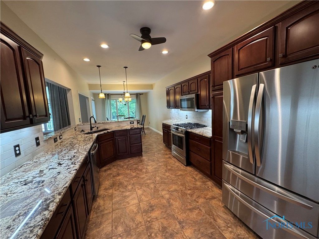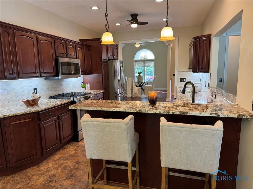 Beautiful brick ranch features stunning floor to ceiling stone fireplace accompanied w/large windows & vaulted ceiling. Family room open to Kit/Dining area. High ceilings thru-out. Spacious eat-in kit w/new SS appliances ('22), fridge ('25). New granite counters ('22). New carpet in all bedrooms ('22). All beds have walk-in closets. Primary Suite with shower & tub. Large gorgeous private Deck. Very desirable location, Close to restaurants, shopping, Alarm company contract for 1 year. Buyer to take over. Smart technology throughout. Two-car epoxy flooring garage. Motivated seller!
